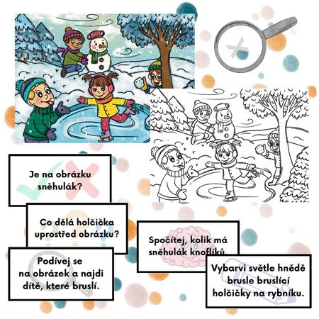 Tento originální a vizuálně poutavý materiál je ideální pro rozvoj porozumění textu, pozornosti, logického uvažování a jemné motoriky. Jeho středobodem je barevný obrázek, který zachycuje hravou zimní scénu.