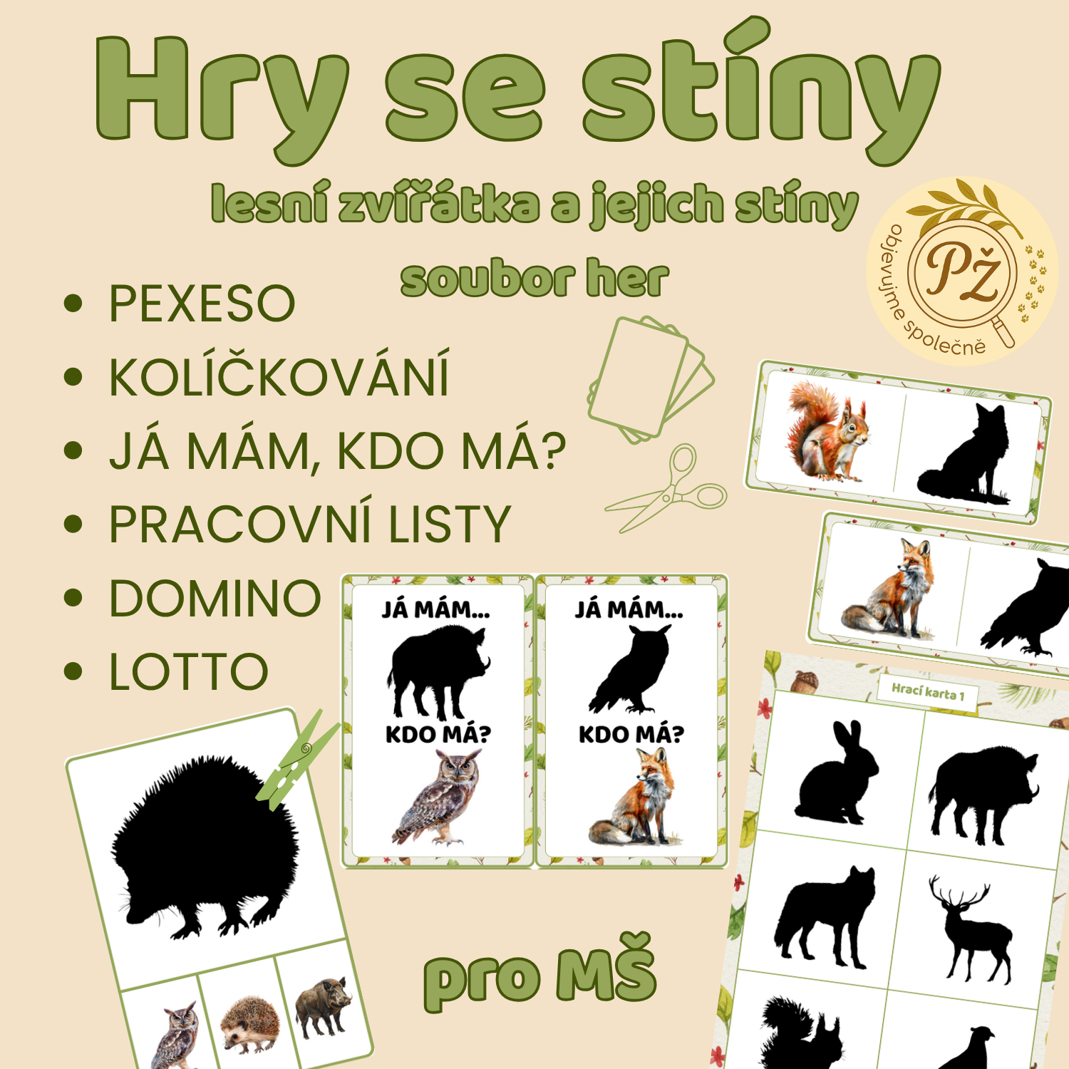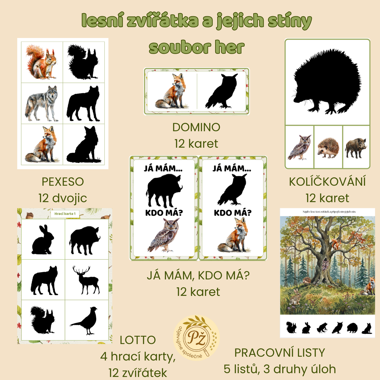 Připravila jsem karetní hry zaměřené na lesní zvířátka a jejich stíny. Jednotlivé hry rozvíjí zrakové vnímání, logické myšlení, schopnost pozorovat detaily, jemnou motoriku, pozornost, soustředění i komunikační dovednosti.