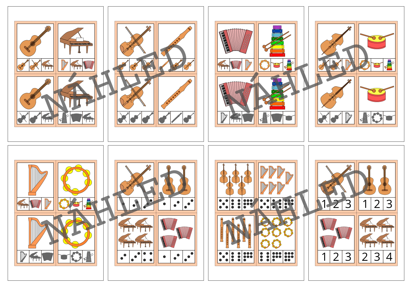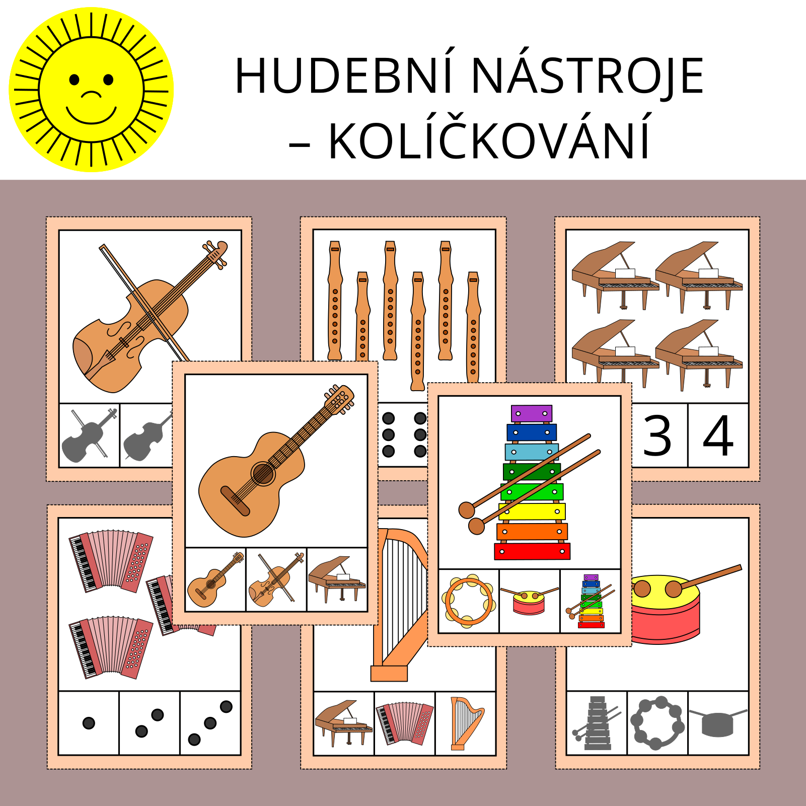 Materiál na téma hudební nástroje slouží k procvičení zrakového vnímání a počítání. Obsahuje 36 kartiček.