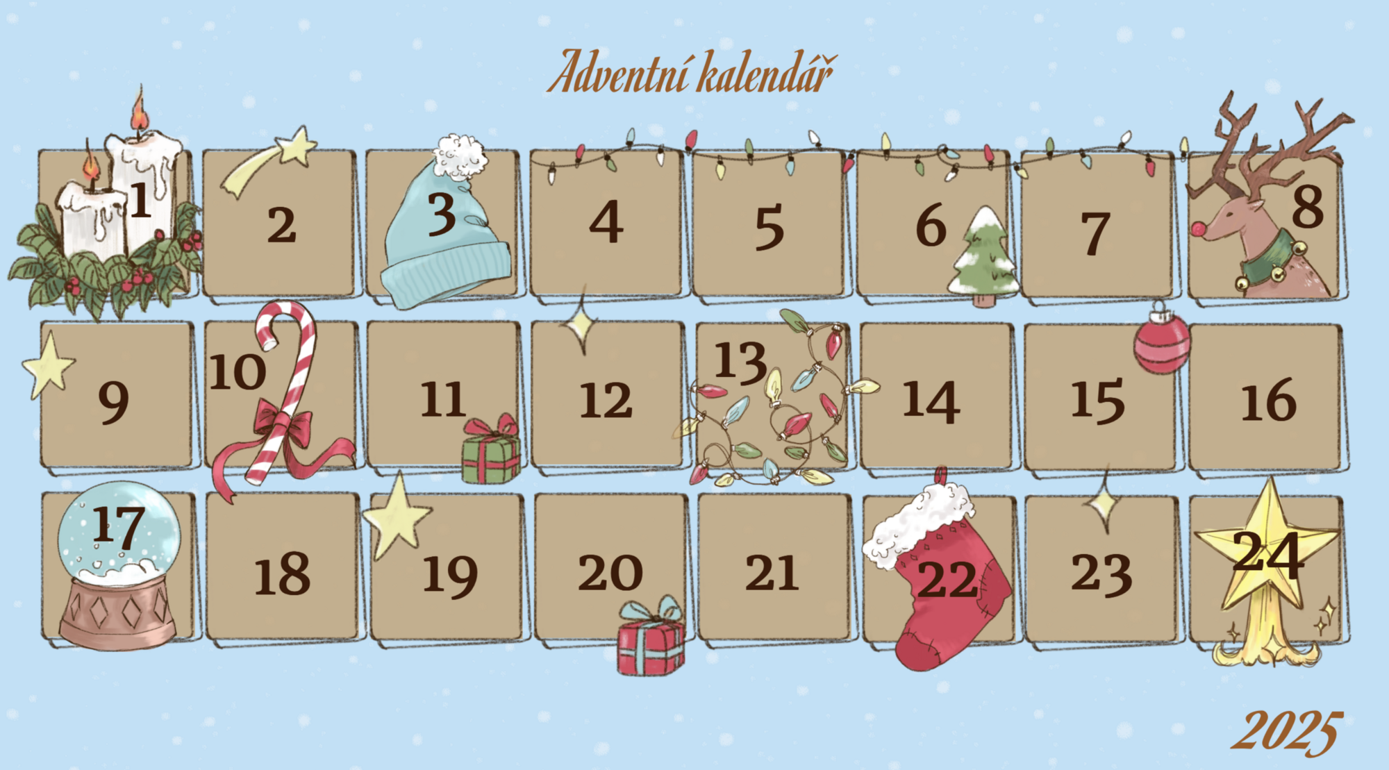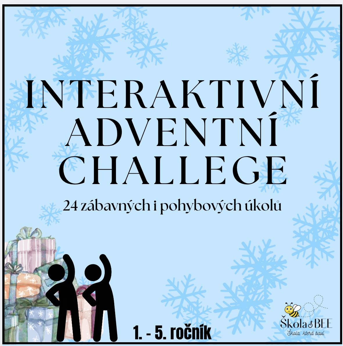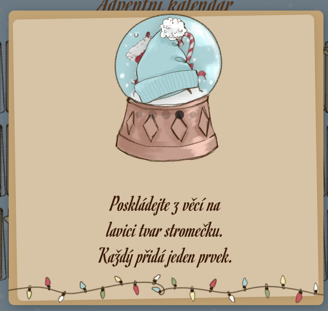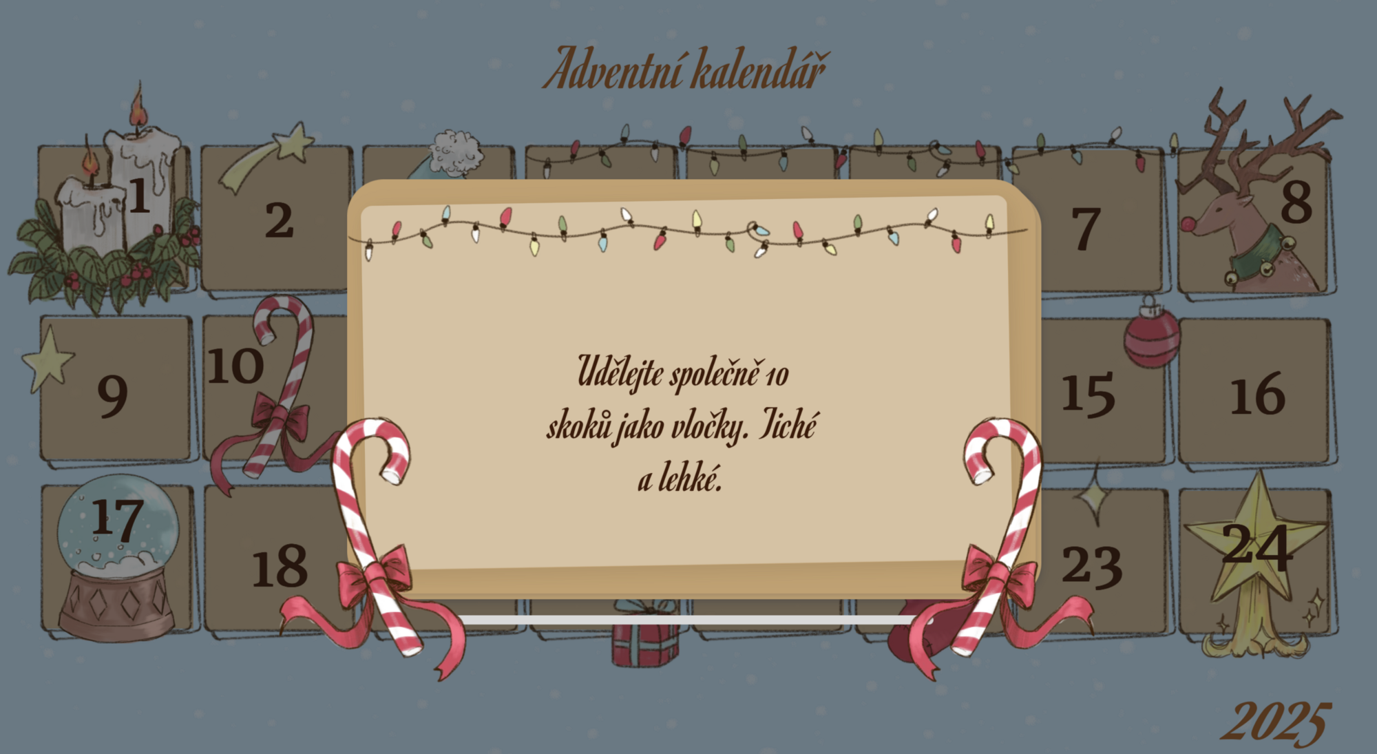 Interaktivní adventní kalendář plný zábavných výzev pro žáky 1.–5. ročníku. Po kliknutí na každé okýnko se otevře krátká aktivita – pohybová, tvořivá, hudební nebo hravá. Úkoly jsou jednoduché, bez přípravy a ideální jako ranní naladění či malé zpestření dne.
