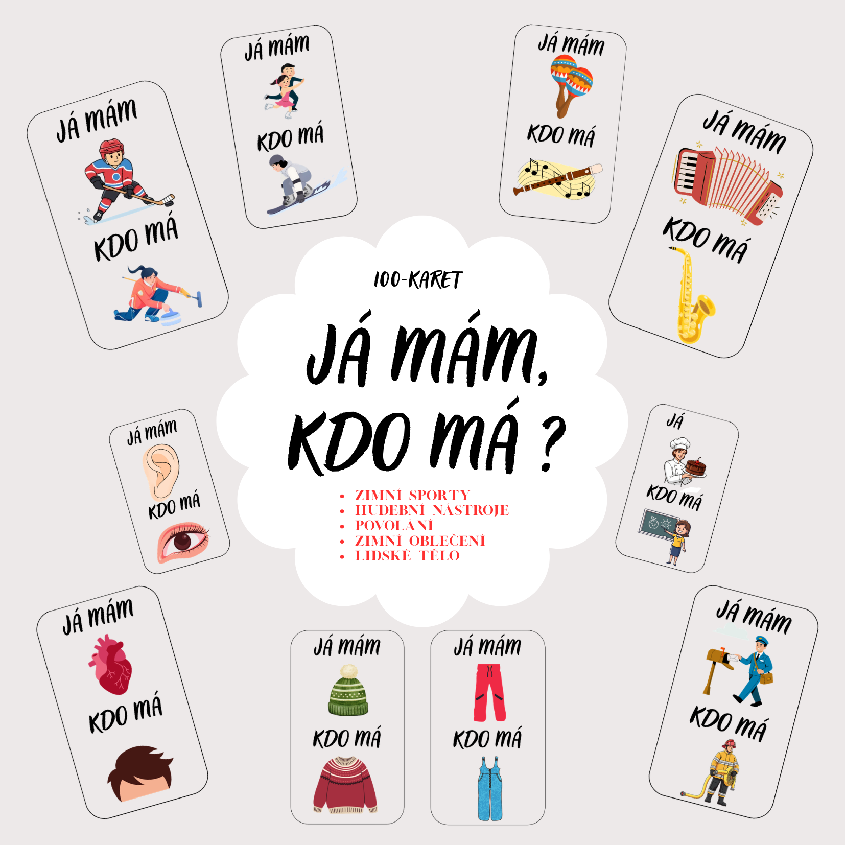 Soubor obsahuje: HRU JÁ MÁM, KDO MÁ - 100 KARET NA 5 TÉMAT