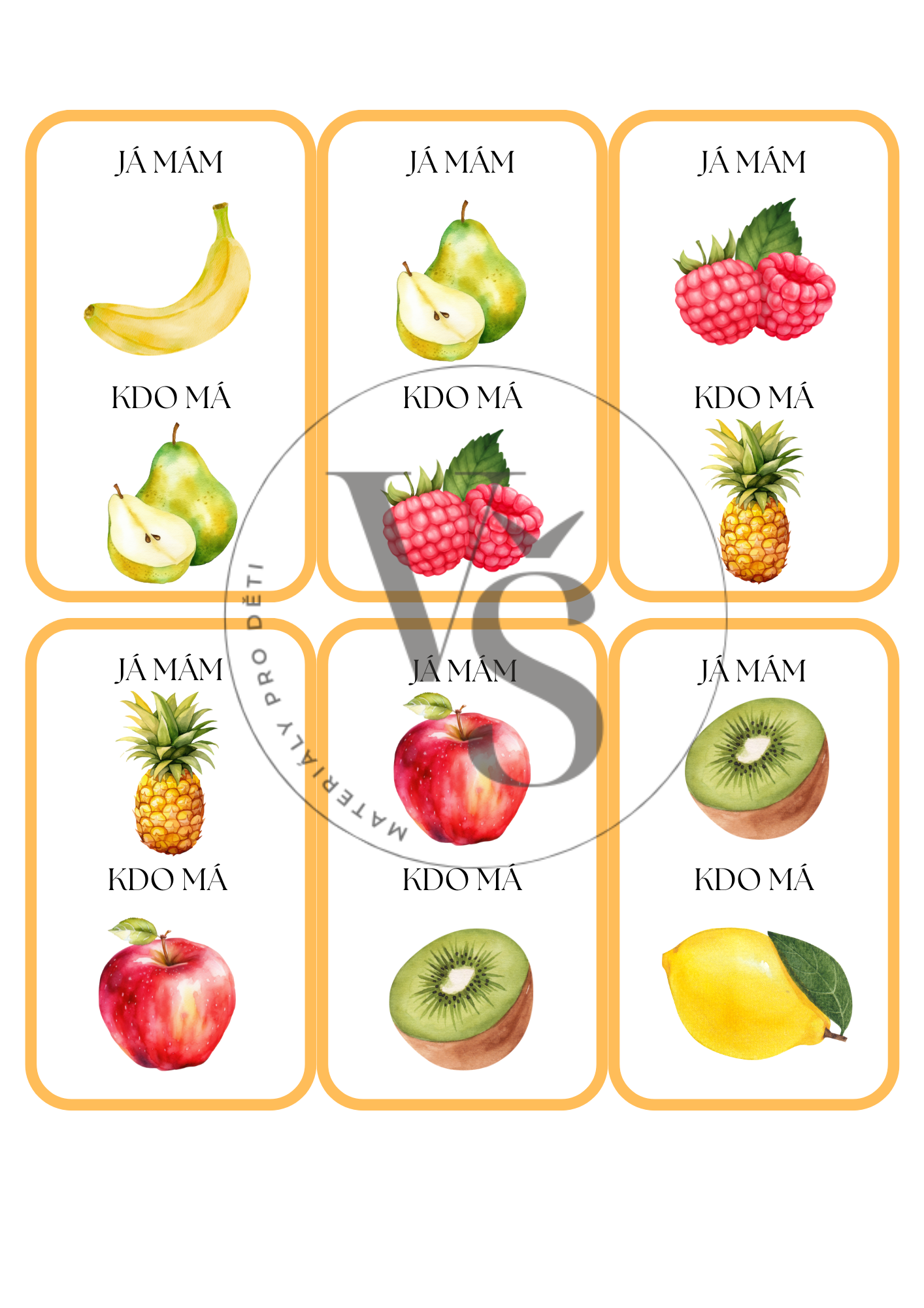 Hra Já mám, kdo má na téma ovoce. V souboru najdete 24 hracích karet s obrázky.