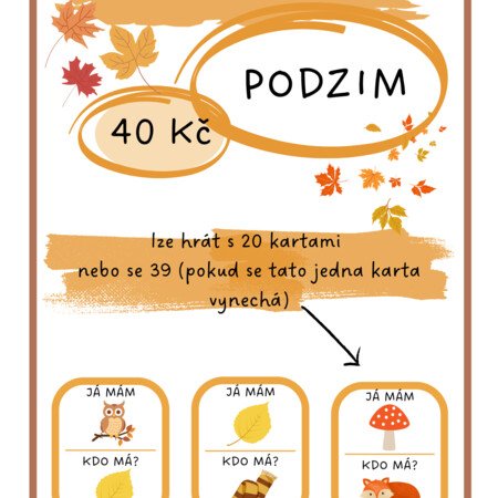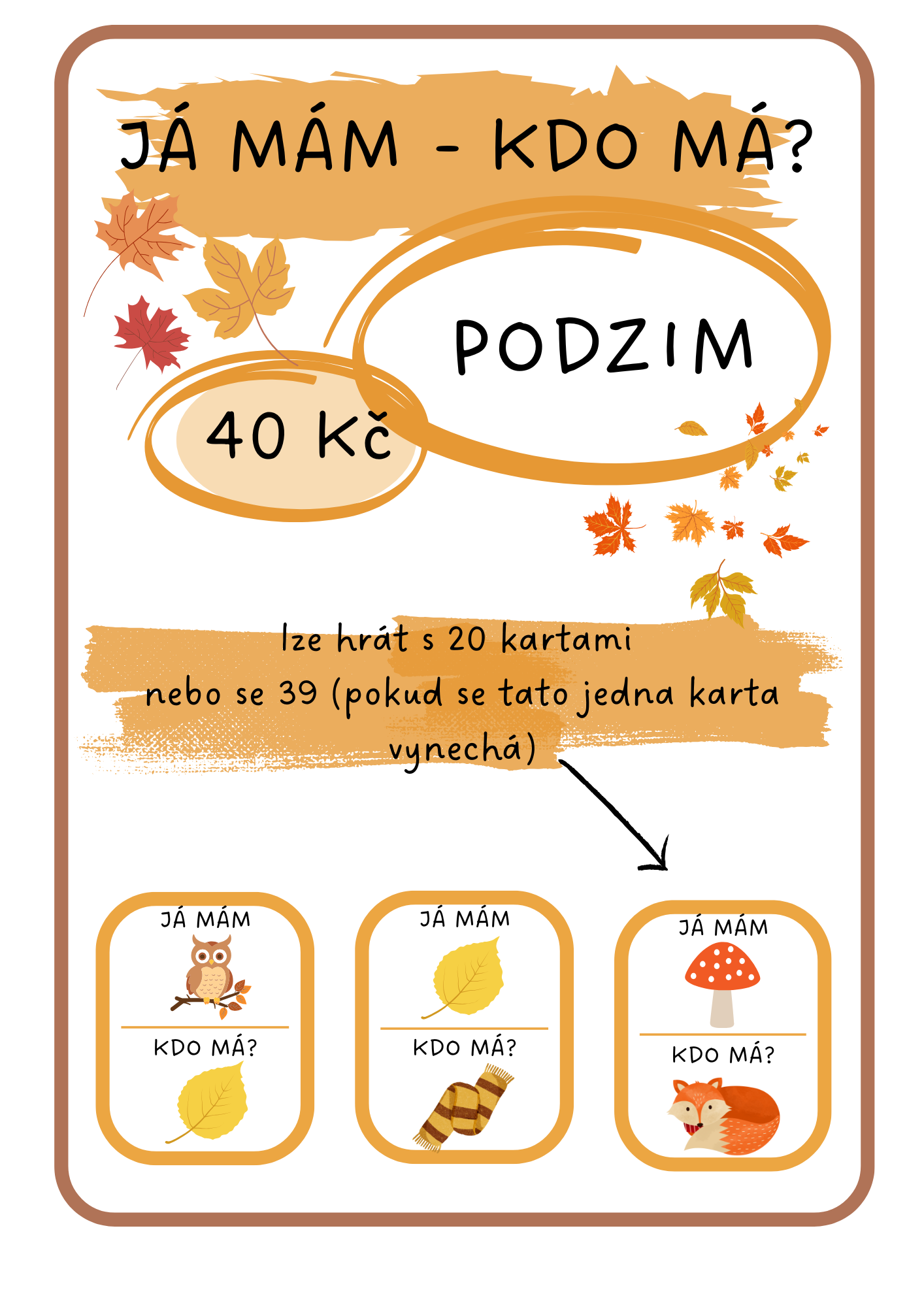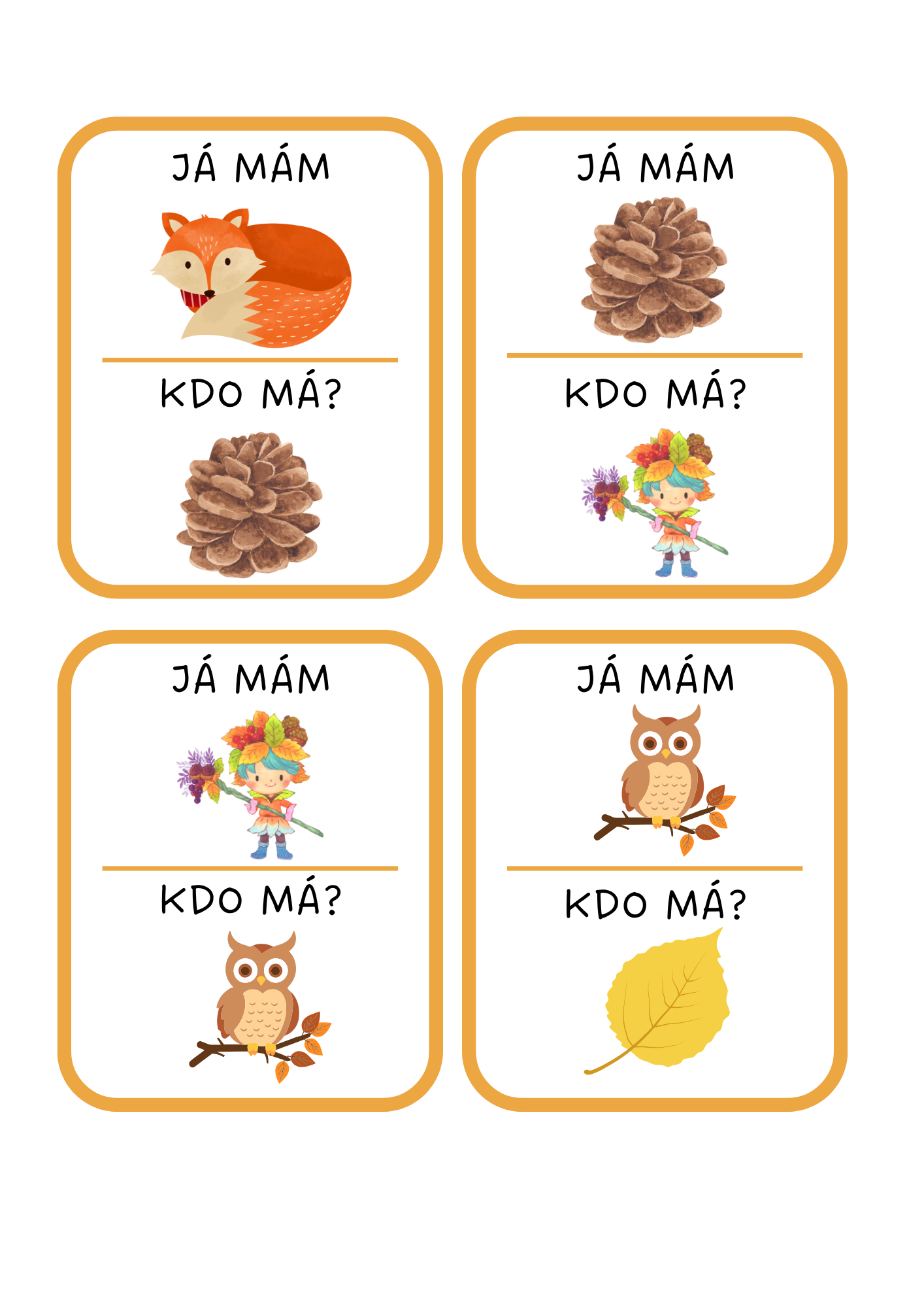 Zábavná hra "Já mám, kdo má?", kterou lze využít pro mladší děti jako domino. Tematicky laděná do podzimu a podzimních barev.