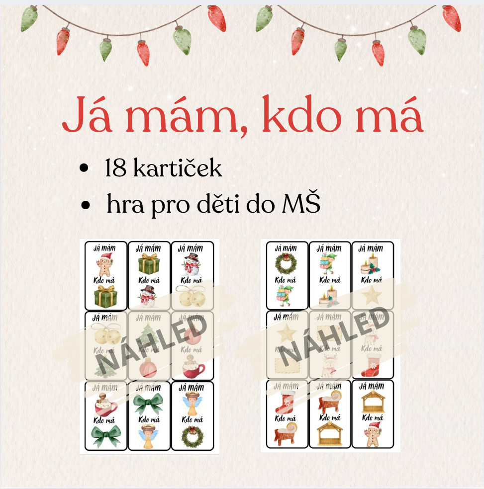Hravá vánoční aktivita plná známých obrázků, která děti zabaví a zároveň rozvíjí pozornost, slovní zásobu a schopnost naslouchat. Díky jednoduchým pravidlům je hra vhodná i pro nejmenší děti a skvěle se hodí do adventního času ve školce.