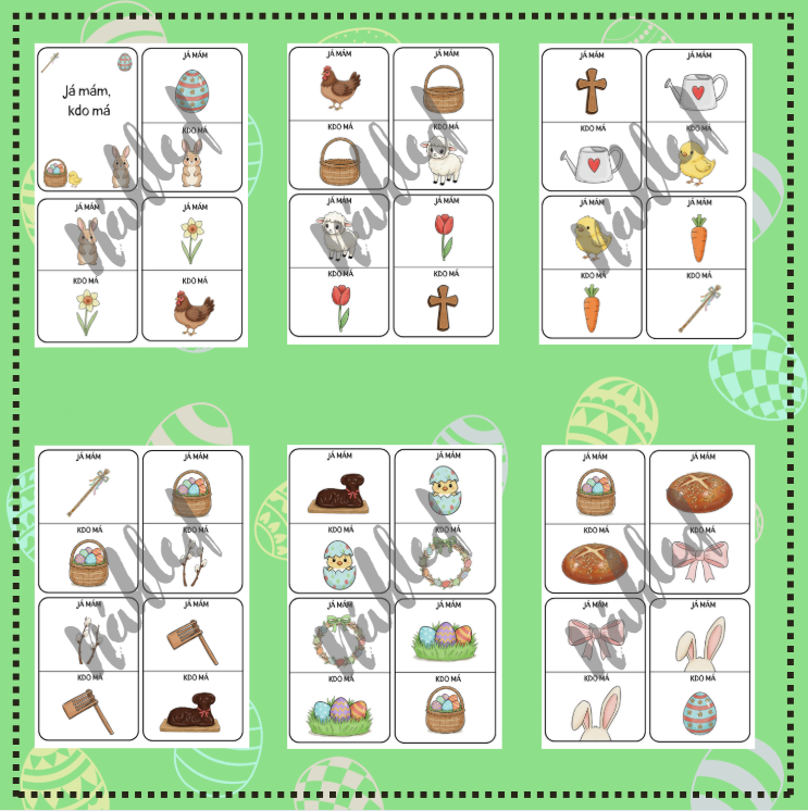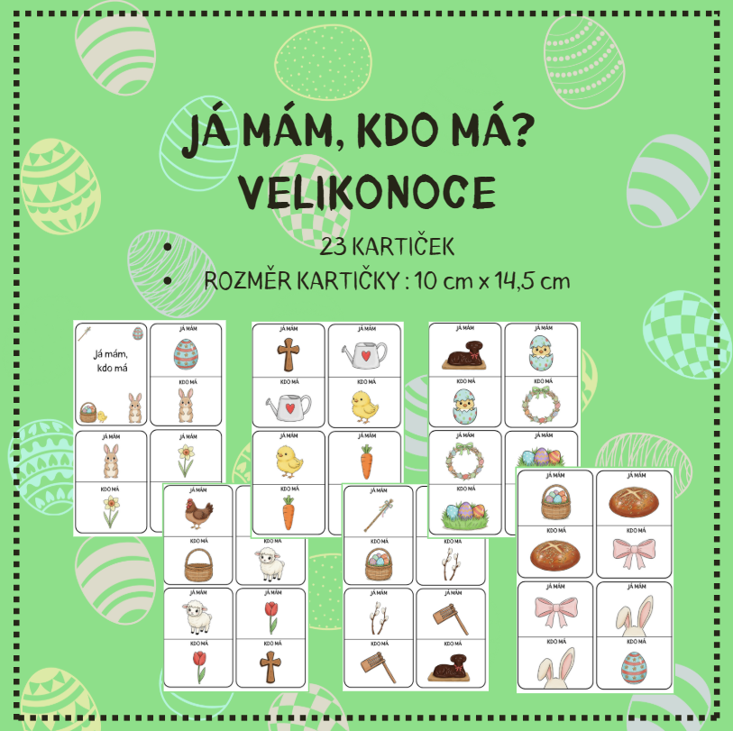 Každé dítě dostane kartičku. Jeden začíná: „Já mám… Kdo má…?“ a hra pokračuje, dokud se neuzavře kruh. Jednoduché, zábavné – a pokaždé jiné!