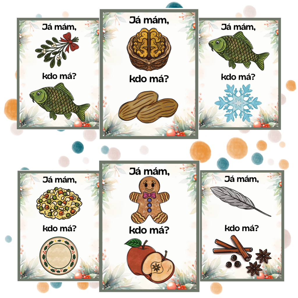 Každé dítě dostane jednu kartu. První dítě řekne, co má na obrázku “Já mám, ….” a zeptá se, kdo má obrázek pod ním “kdo má ….?”.