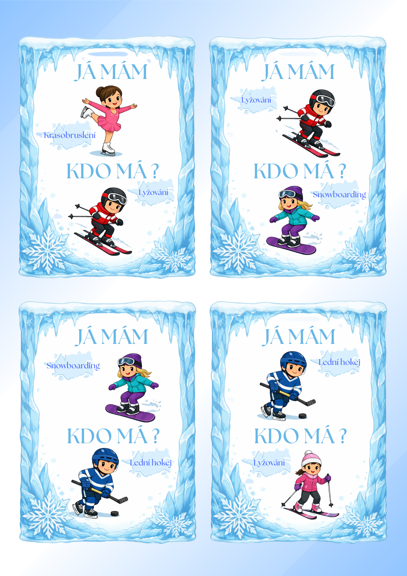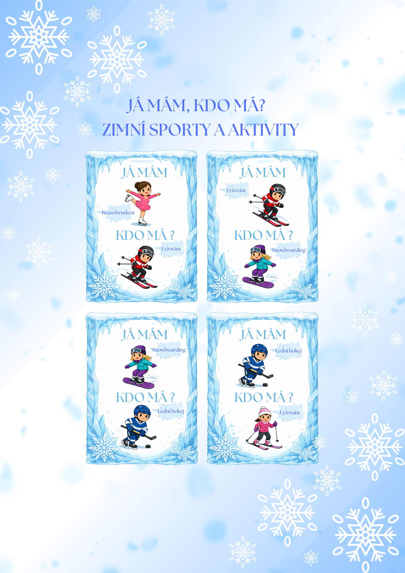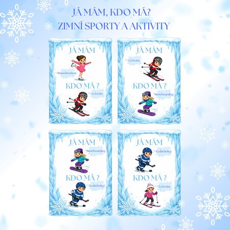 Tento soubor obsahuje 6 stran didaktických karet s celkem 24 originálními, barevnými obrázky se zimními sporty a aktivitami. Stačí je vytisknout, zalaminovat a děti mohou hned hrát a učit se zábavnou formou.