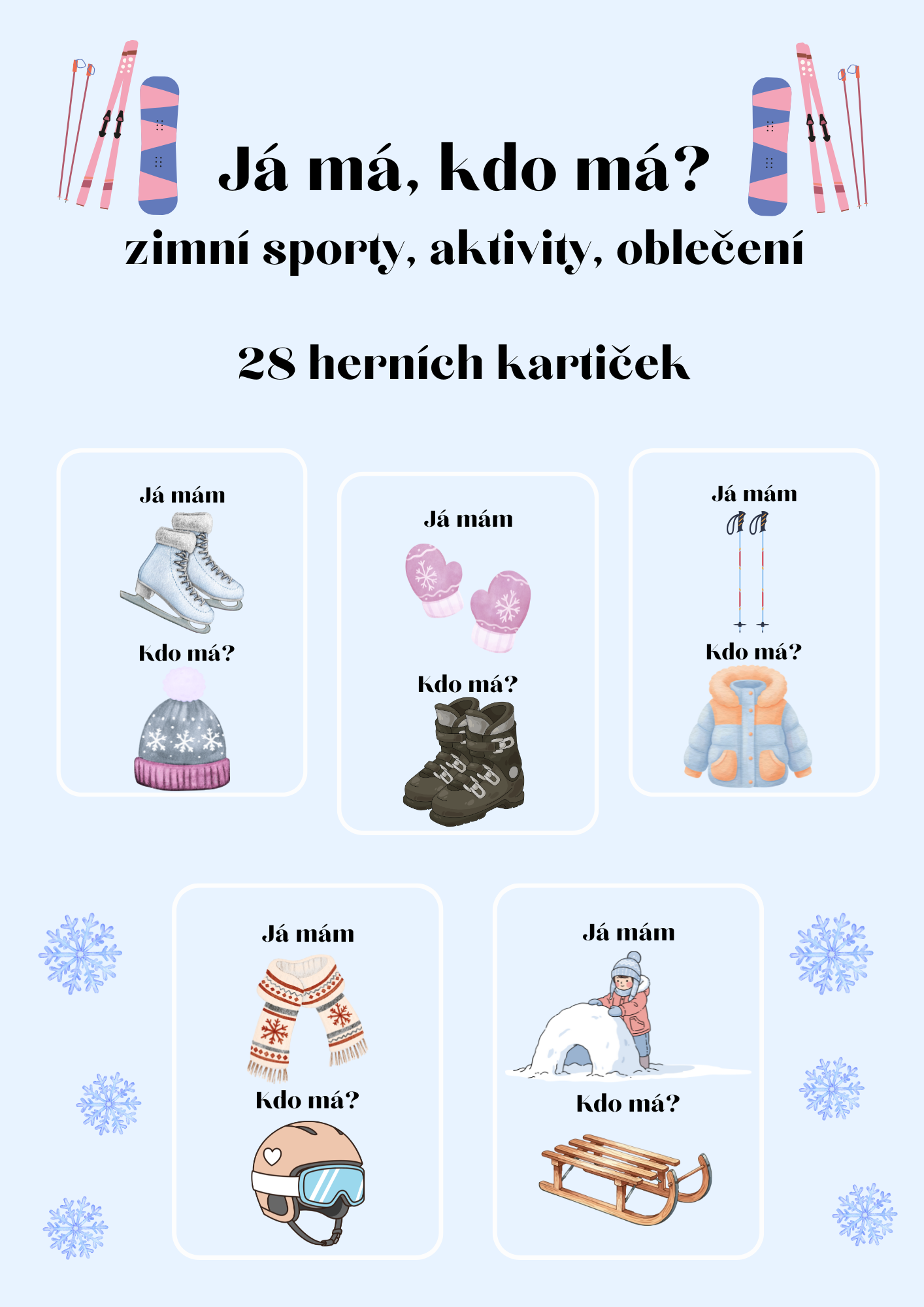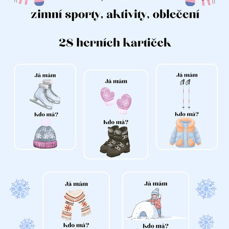 Soubor obsahuje 28 herních kartiček s obrázky vztahujících se k tématu "zimní sporty, aktivity, oblečení".