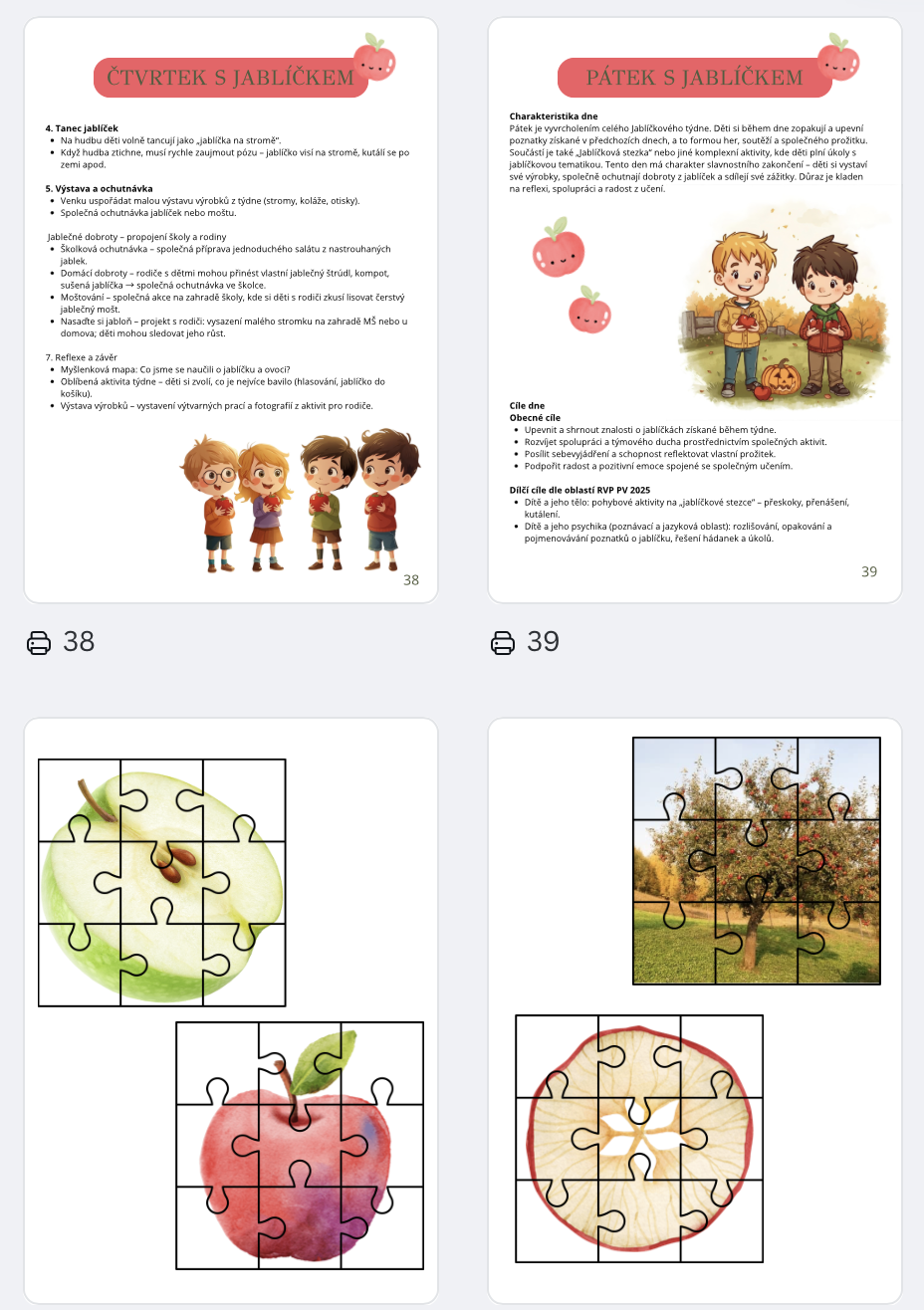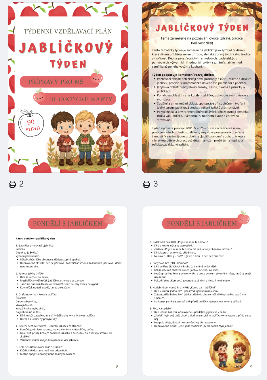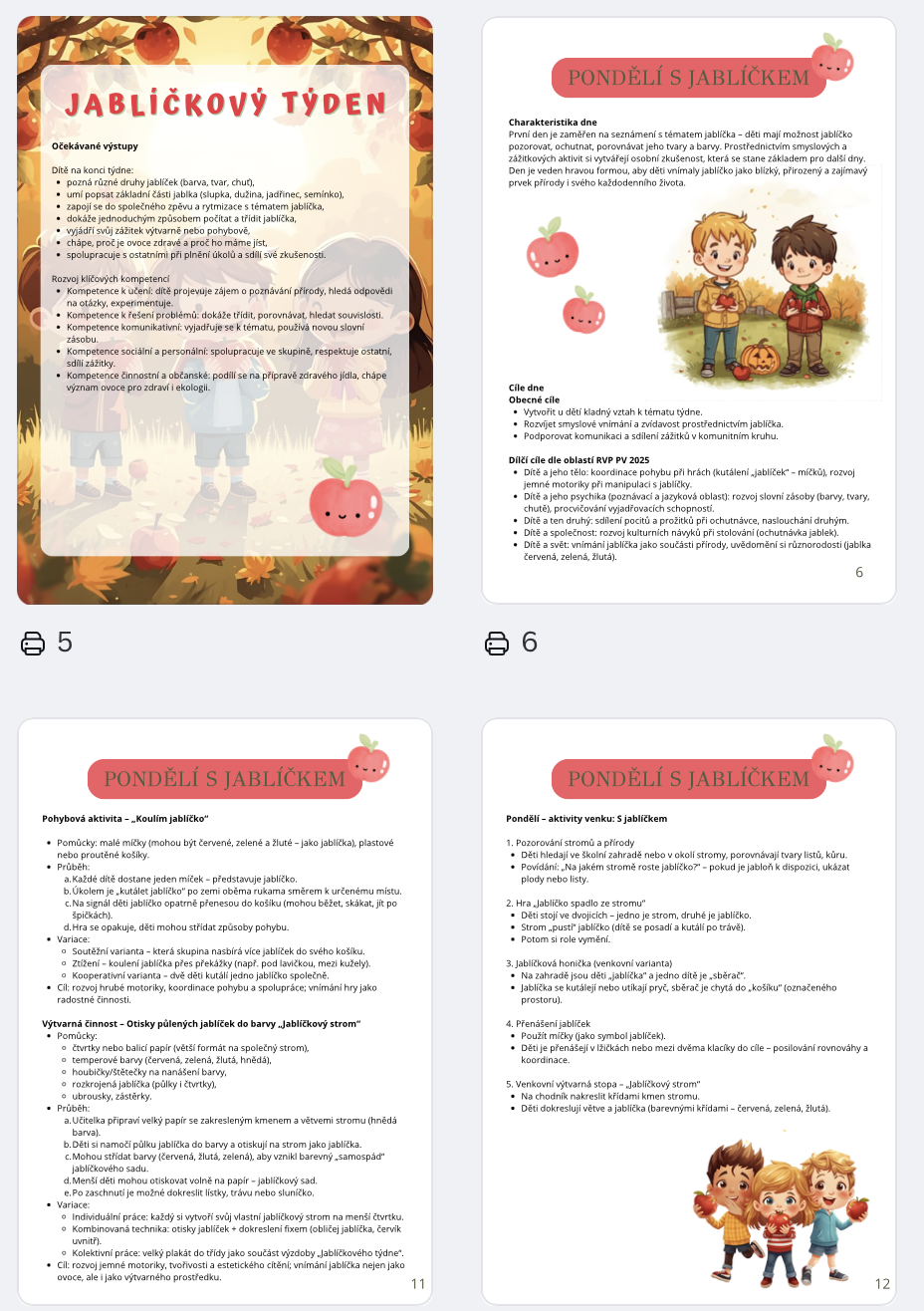 Tento soubor je komplexní týdenní vzdělávací plán na téma jablíčka a ovoce, který propojuje všechny vzdělávací oblasti rozvoje. Materiál obsahuje denní přípravy od pondělí do pátku, nápady na ranní kruhy, pohybové aktivity, výtvarné činnosti, environmentální vzdělávání i reflexi.