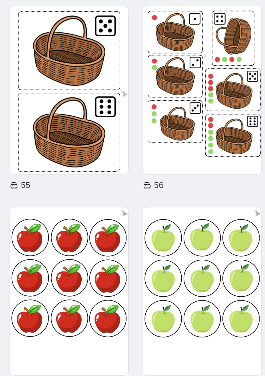 - matematické a logické hry (košík s jablíčky, třídění podle barvy, počítání),