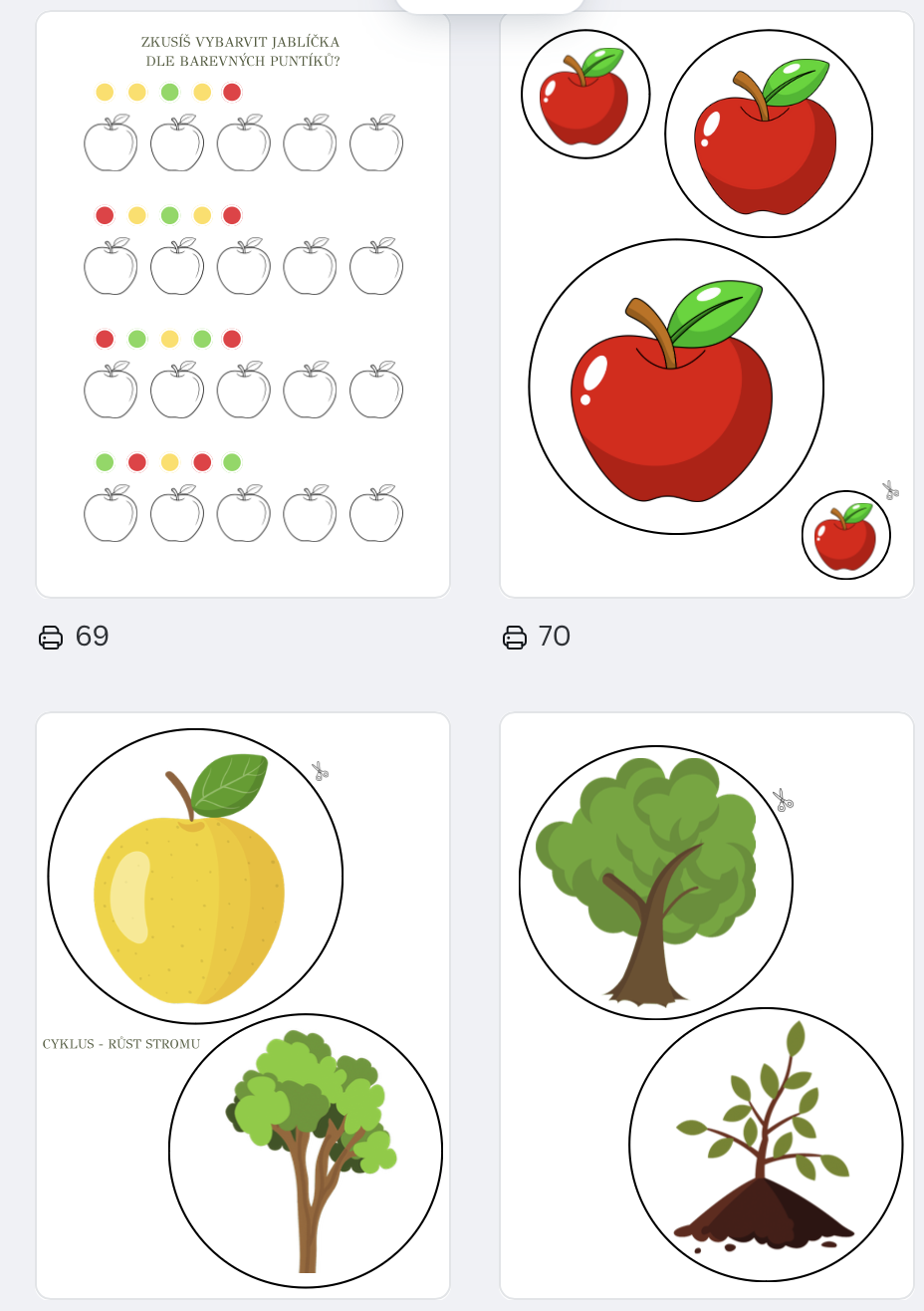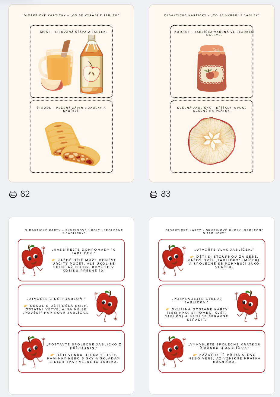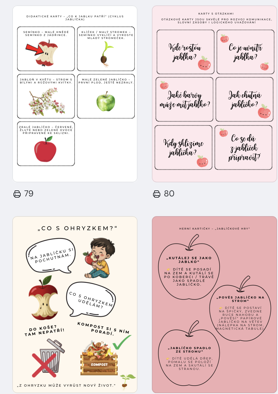 - karty „Co se vyrábí z jablek“ (mošt, štrúdl, kompot, křížaly),
