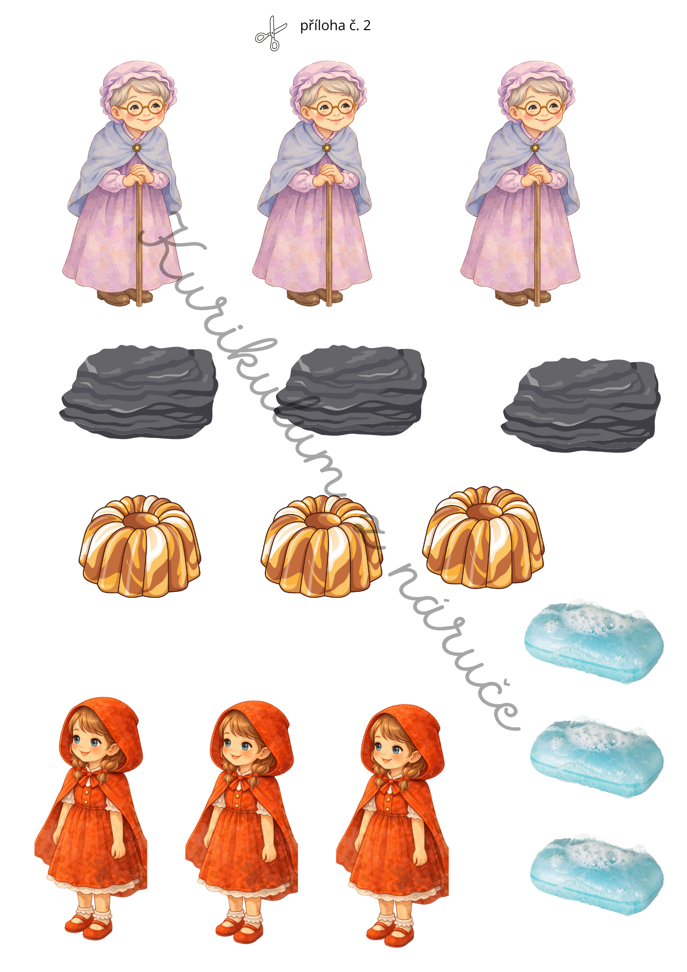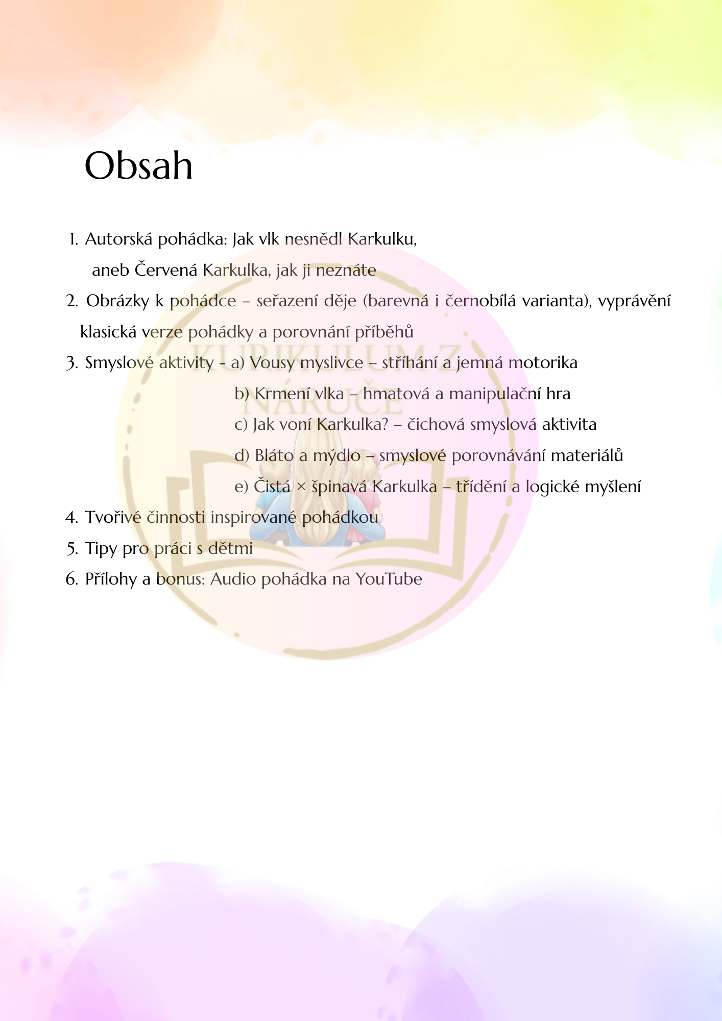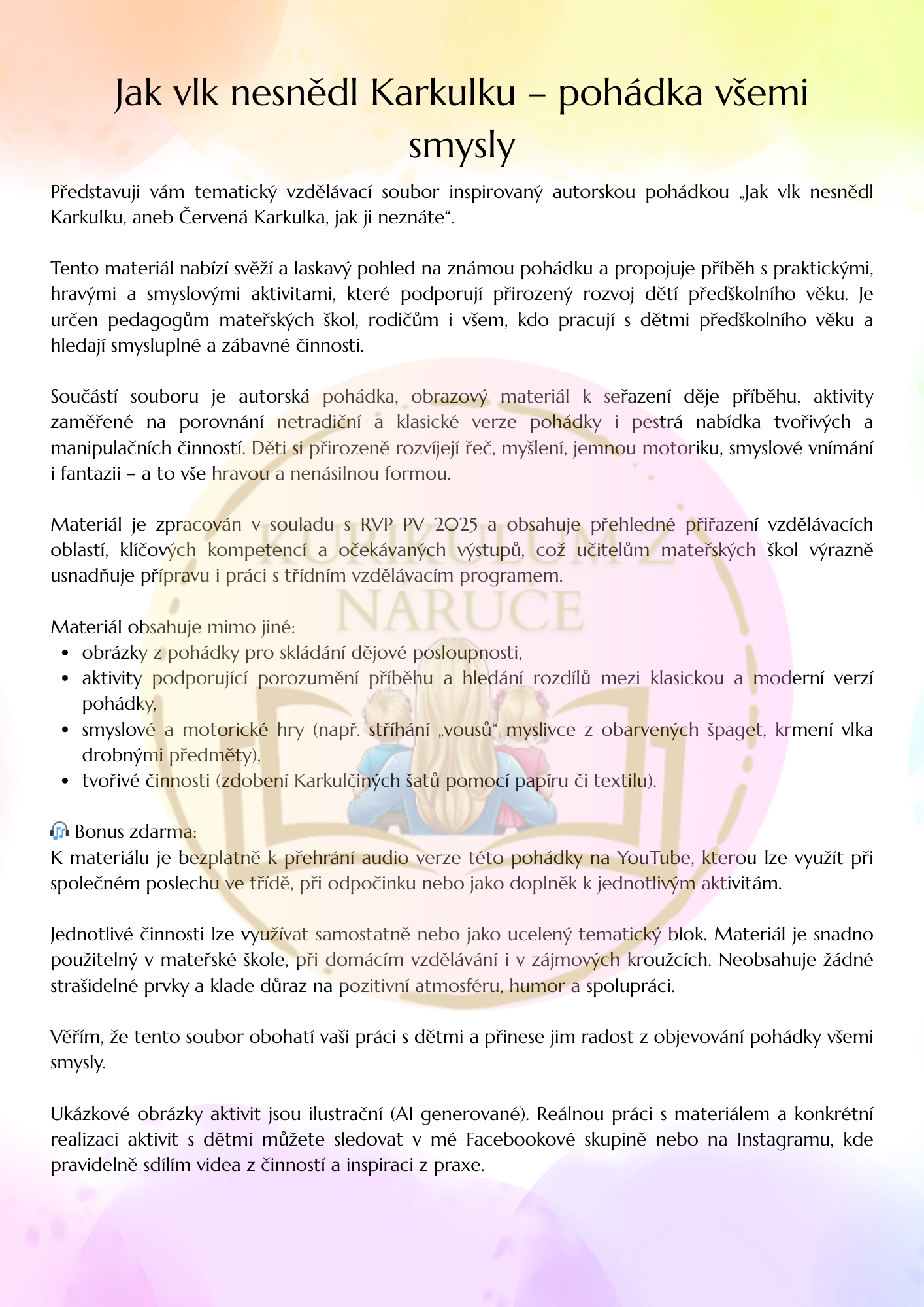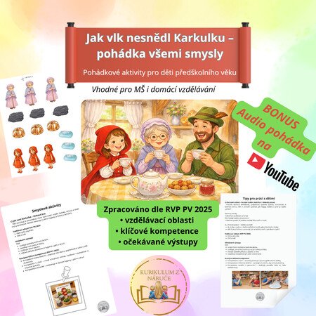 Tento tematický vzdělávací soubor vychází z autorské pohádky „Jak vlk nesnědl Karkulku, aneb Červená Karkulka, jak ji neznáte“ a propojuje příběh s pestrou nabídkou smyslových, pohybových, tvořivých a manipulačních aktivit.