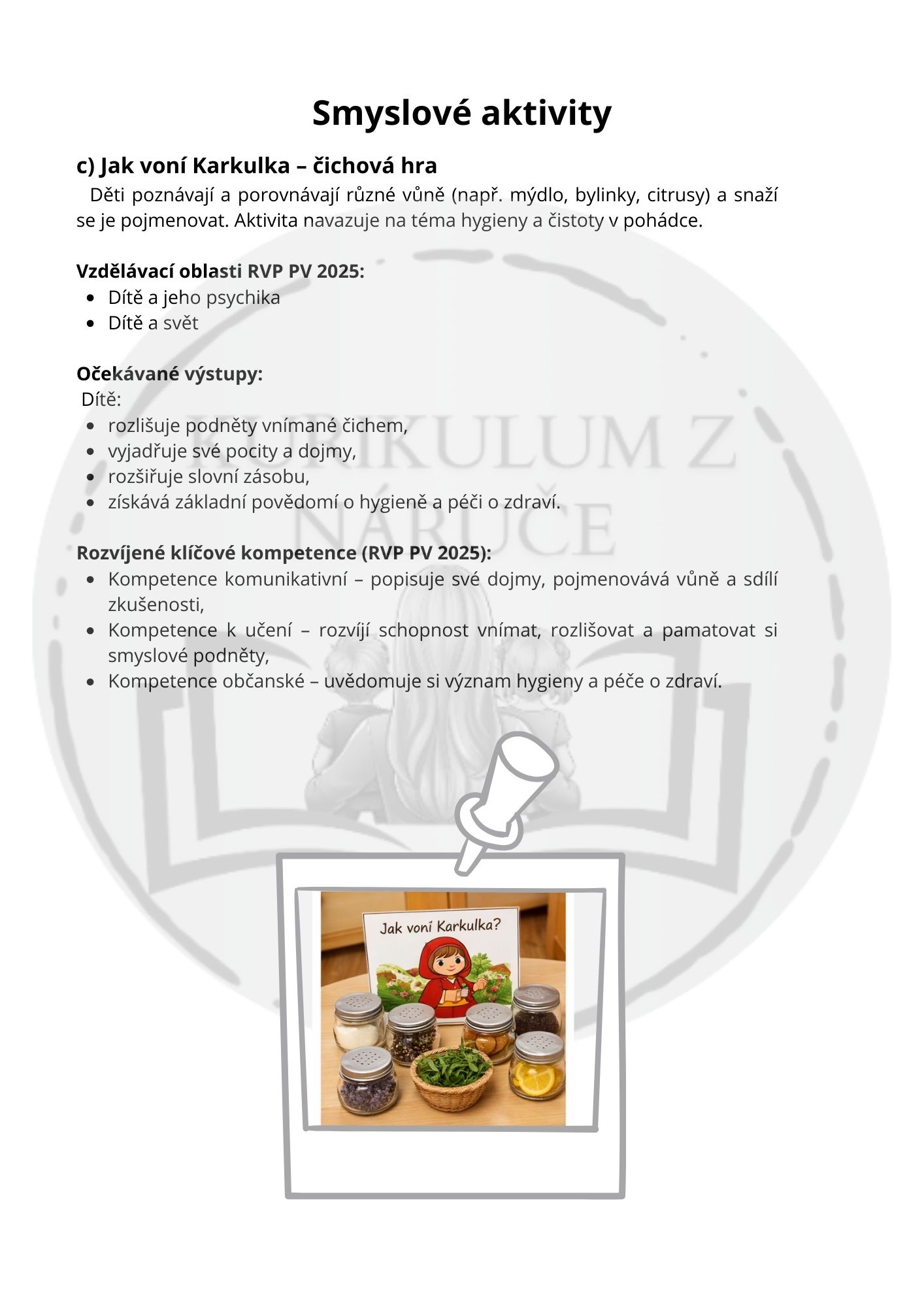 Ukázkové obrázky aktivit jsou ilustrační (AI generované). Reálnou práci s materiálem a konkrétní realizaci aktivit s dětmi můžete sledovat ve Facebookové skupině nebo na Instagramu - Kurikulum z náruče.