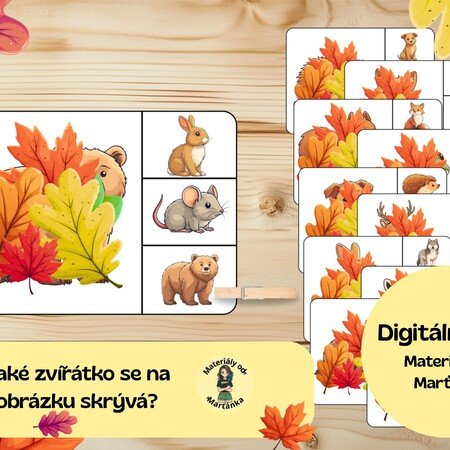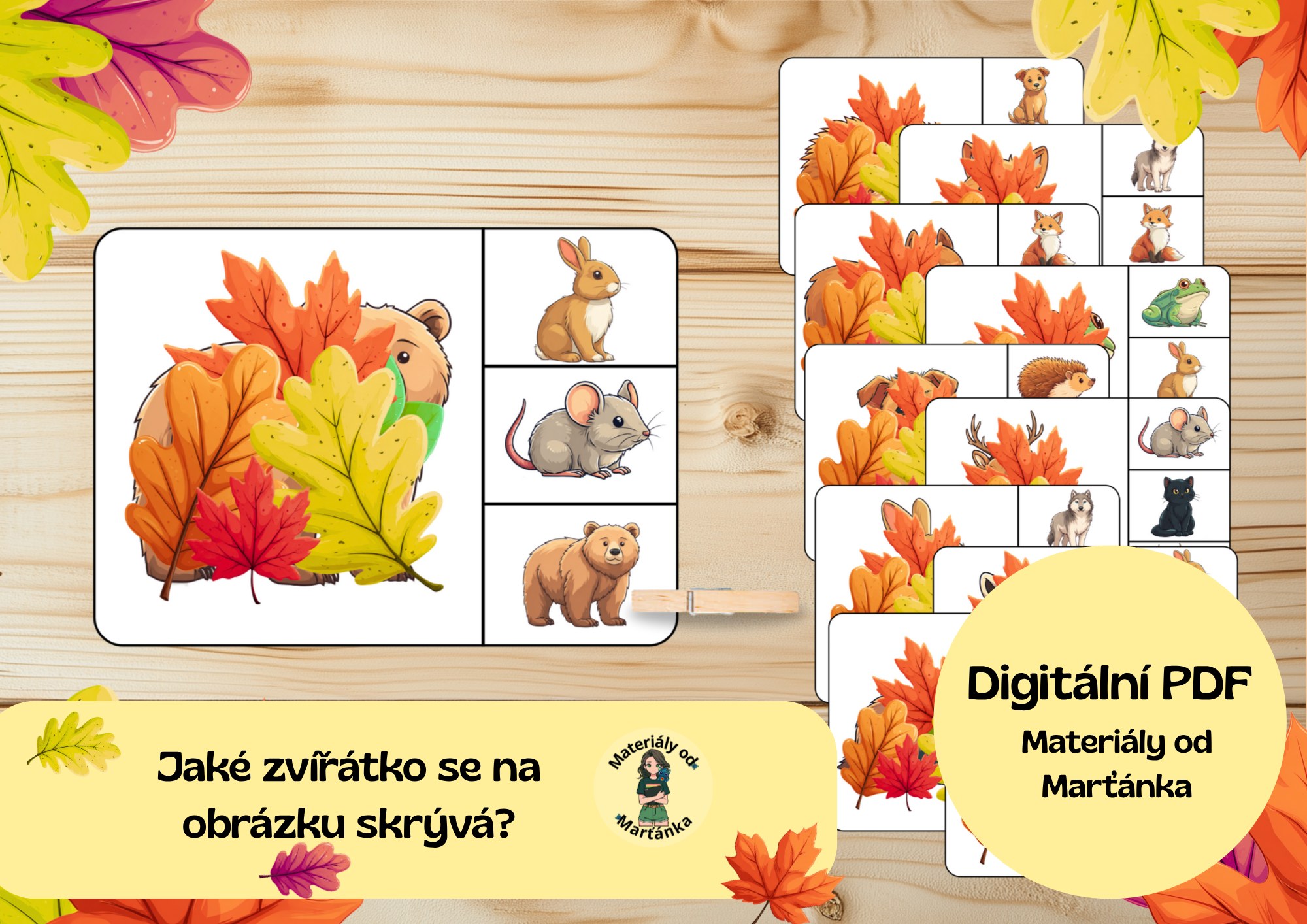 Zábavná a naučná aktivita pro děti, při které se trénuje postřeh, logické myšlení i slovní zásoba. Za podzimními listy se schovávají lesní i domácí zvířátka a úkolem dětí je poznat, které zvíře se na kartičce skrývá.