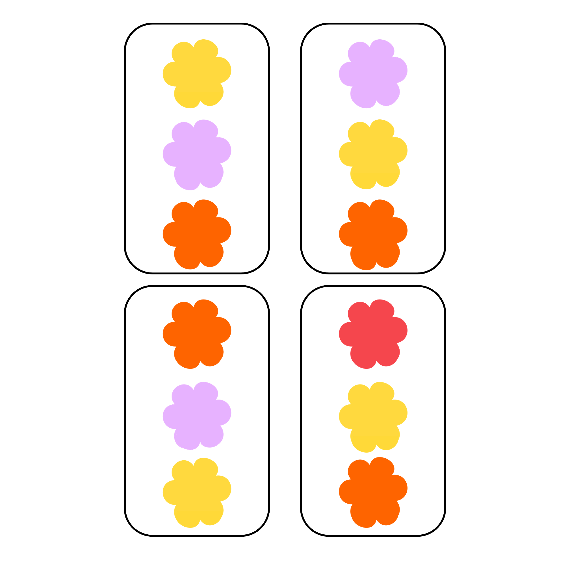 - Barevné konvičky: Logické přiřazování kytiček ke konvičkám stejné barvy, které pomáhá upevňovat znalost základních barevných odstínů.