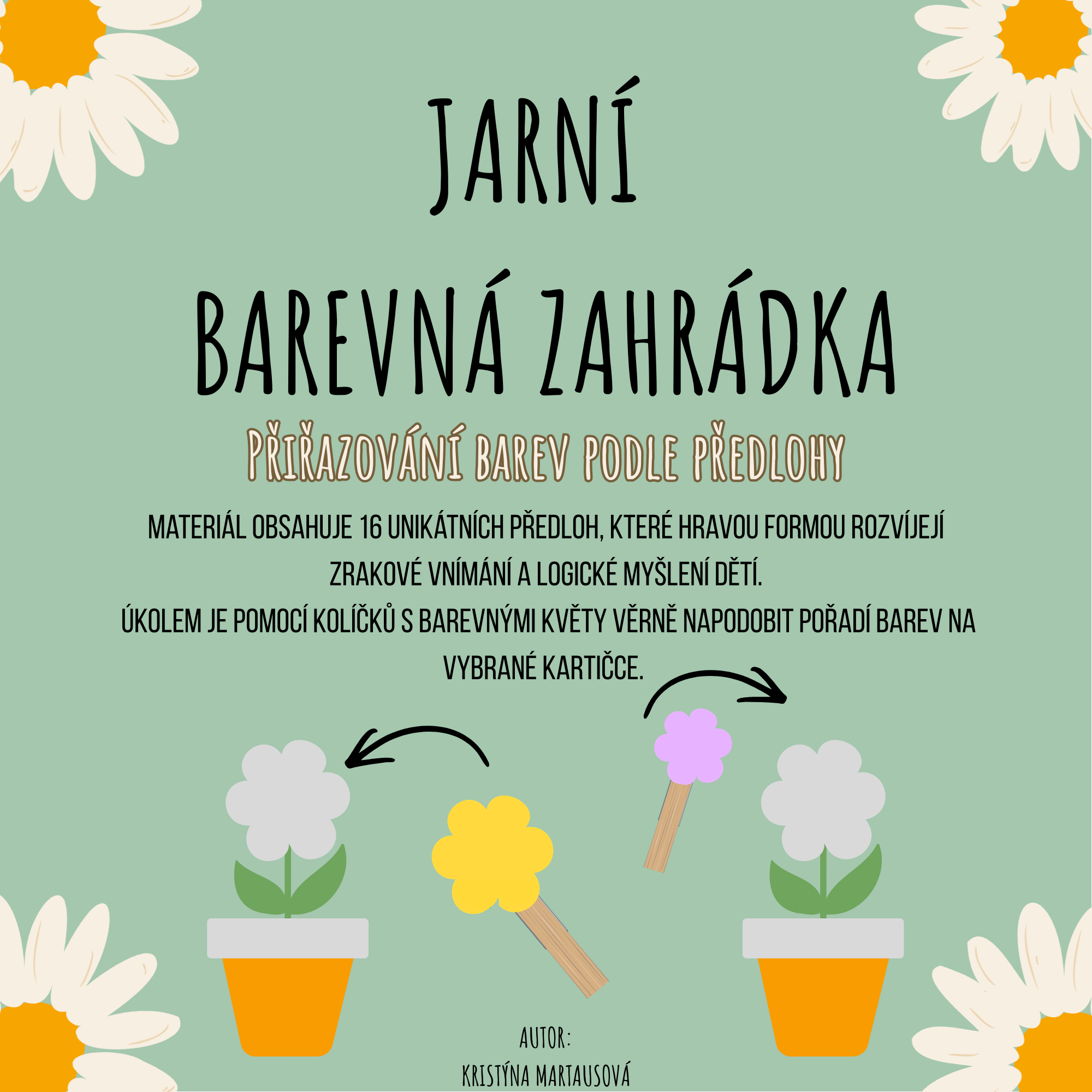 Tento didaktický soubor je ideálním společníkem pro jarní dny v mateřské škole nebo v domácím vzdělávání. Hravou formou pomáhá dětem rozvíjet zrakové vnímání, jemnou motoriku a logické myšlení při práci s barvami a tvary. Celý materiál je laděn do veselých jarních barev, které rozzáří každou dětskou poličku nebo pracovní stůl.
