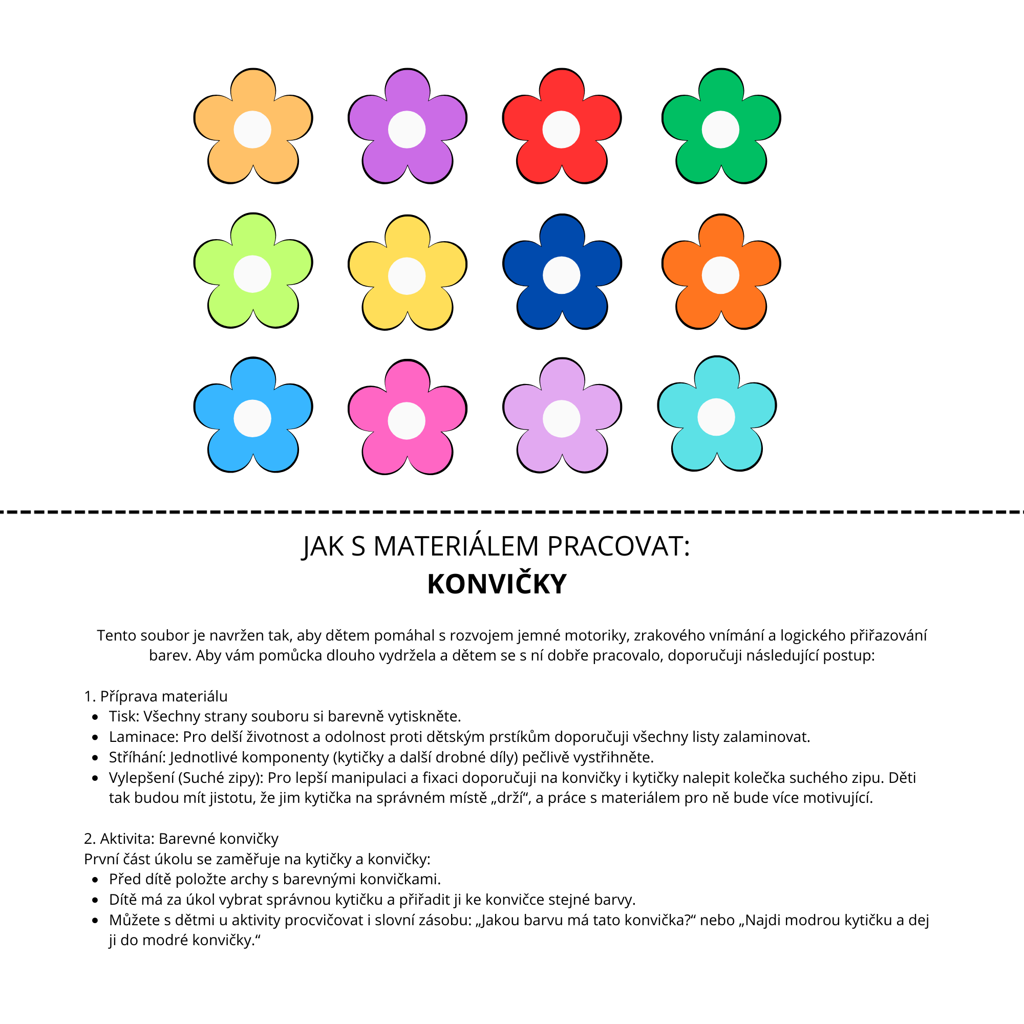 Děti budou „zalévat“ kytičky do správných konviček a skládat okvětní lístky podle barevných předloh. Stačí vytisknout, zalaminovat a zábava může začít! (Malý tip: Se suchými zipy je to pro děti naprostá pecka!)