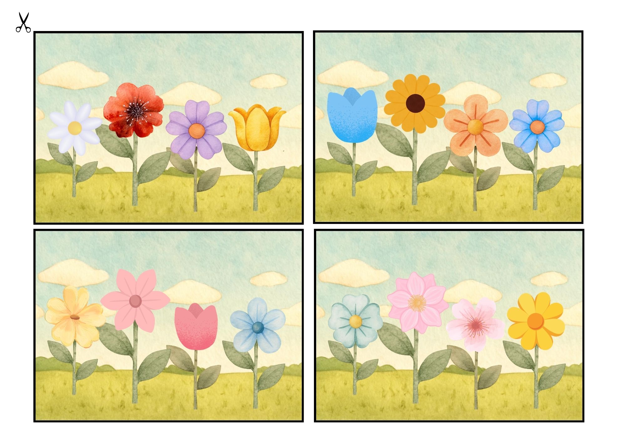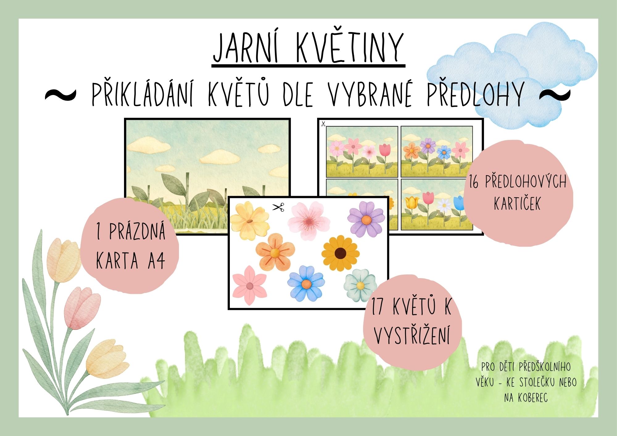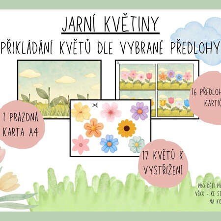 Dítě si vybere kartičku se 4 květy, podle které vybírá správné květy z nabídky a přikládá na připravenou kartu s prázdnými stonky.