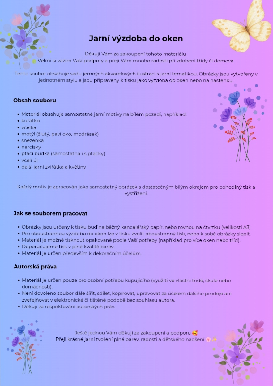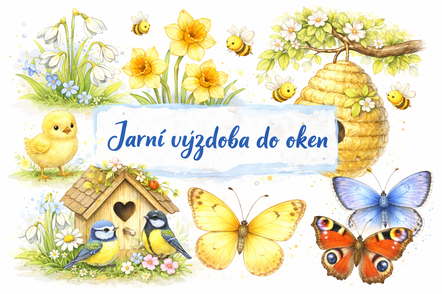 Soubor obsahuje sadu jarních ilustrací, které jsou připravené k tisku na bílém pozadí, ideální jako výzdoba do oken, na nástěnku nebo do tematického koutku.