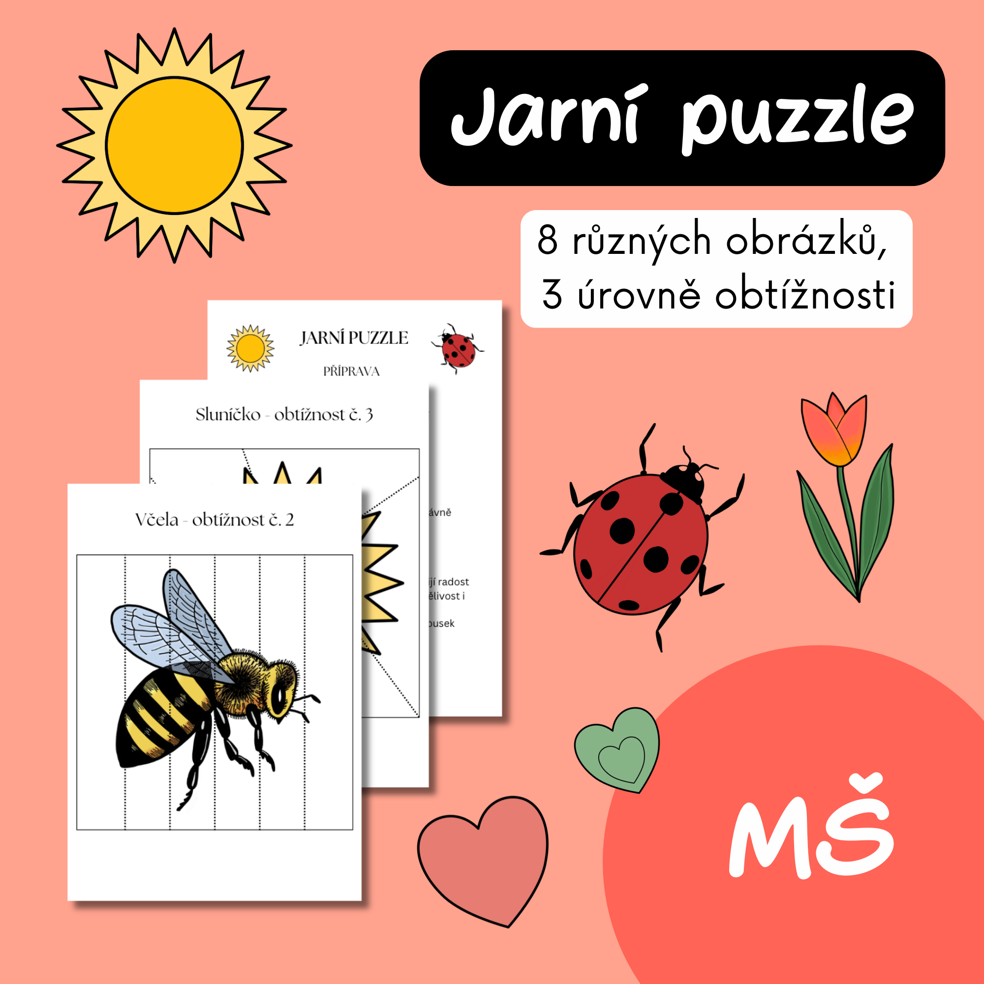 - 8 jarních obrázků (slunce, ptáček, mrak, motýl, duha, včela, beruška, kytička)