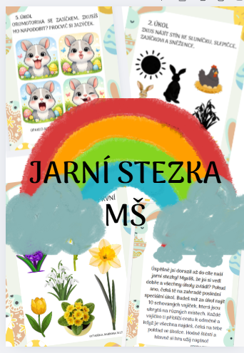 12 úkolů po okolí mateřské školy (velikonoce, jarní kytičky, domácí zvířata, počasí, tradice, hledání stínů...) všeobecný jarní přehled