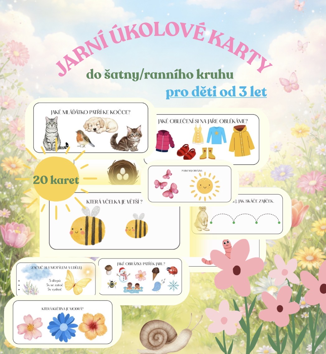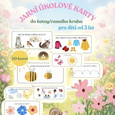 Tyto jarní úkolové karty jemně a hravě provedou děti světem prvních jarních dnů – mezi rozkvetlé květiny, bzučící včelky, mláďátka, sluníčko i jarní pohyb.