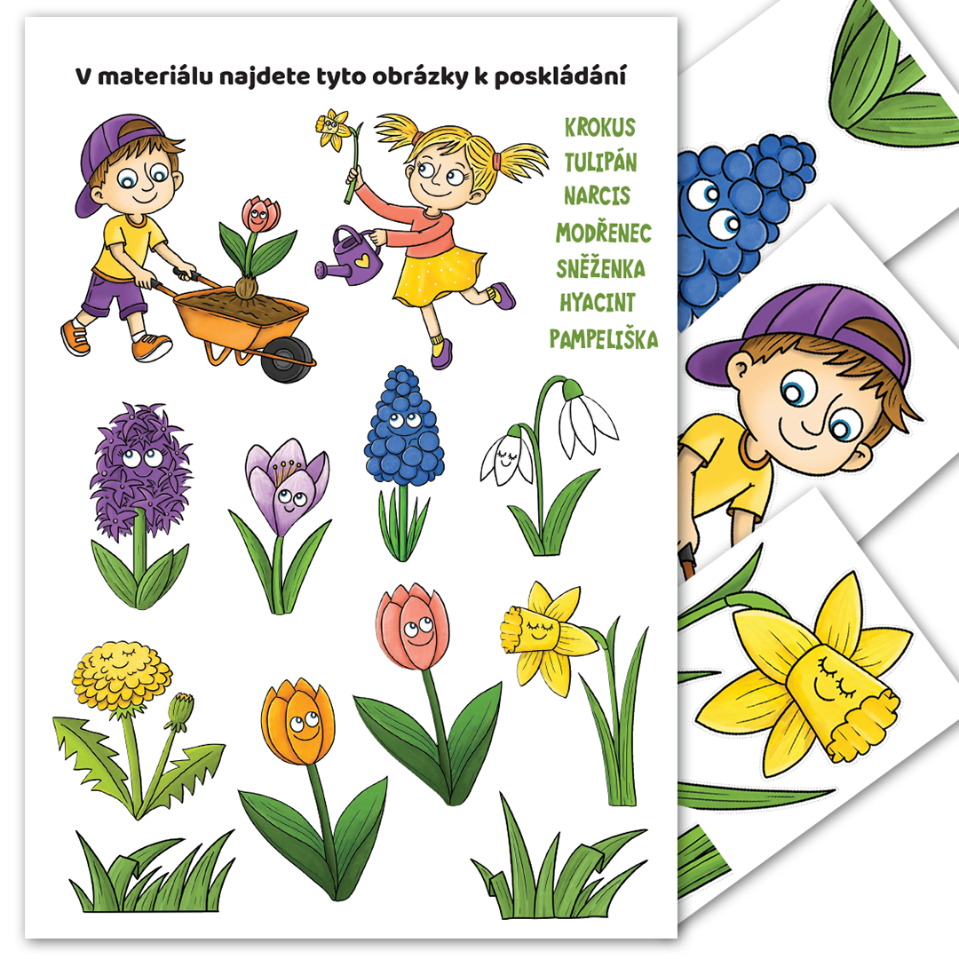 V souboru najdete dvě postavy dětí a jarní květiny (narcis, tulipány, krokus, sněženku, pampelišku, modřenec, hyacint) a také názvy všech těchto květin, které k obrázkům můžete připojit a hned výzdoba získá vzdělávací rozměr.
