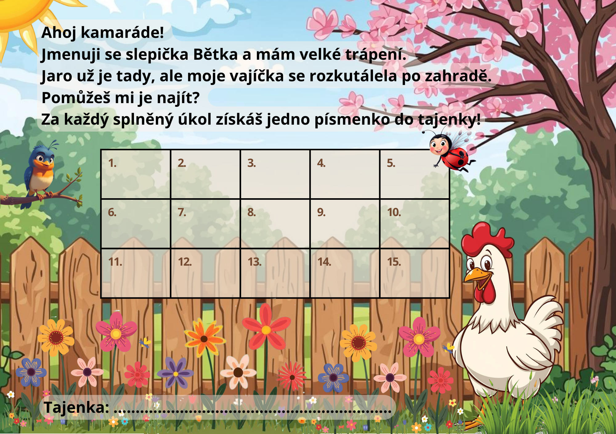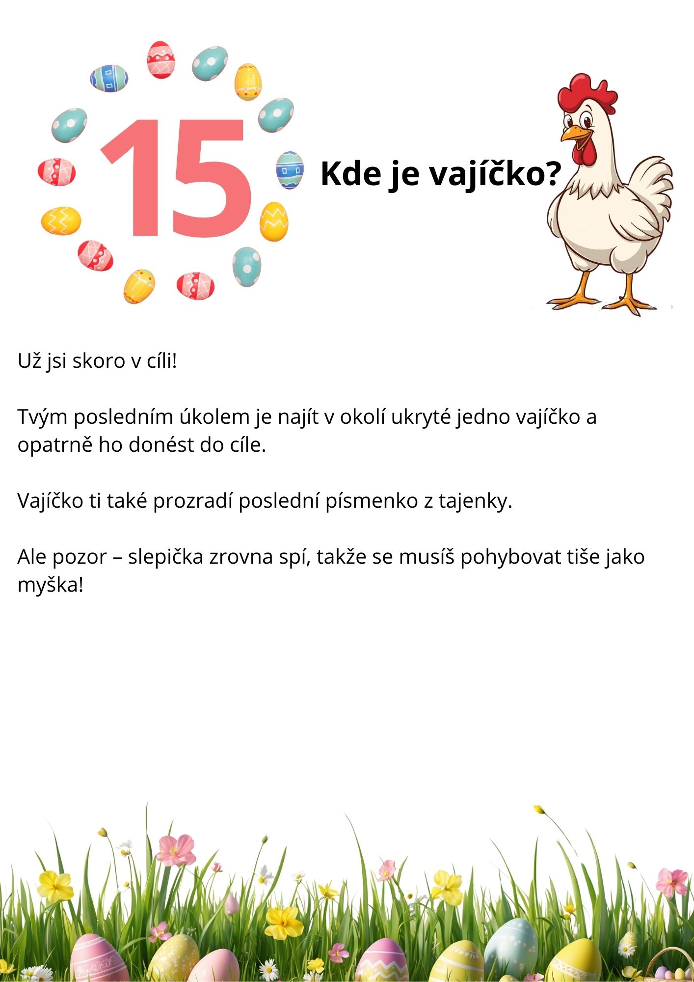 Soubor obsahuje tabulku na zapisování písmenek, 15 samostatných úkolů a vajíčka na vystřihnutí.