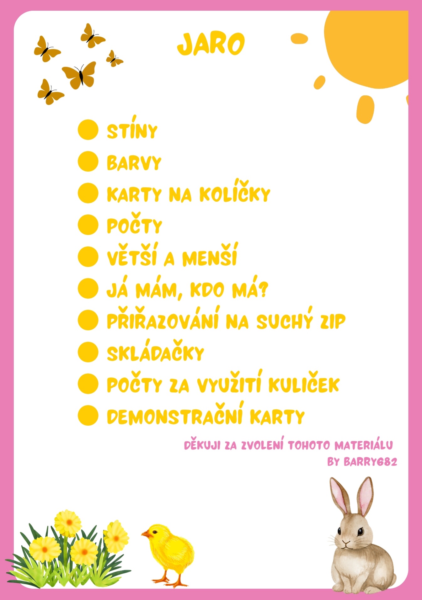 Soubor obsahuje přiřazován barev, stínů, dvojic a překrytých obrázků. Kolíčkování tématických obrázků a počty za využití obrázku ruky. Hru Já mám, kdo má? Posloupnost a porovnávání větší menší. Aktivity na suchý zip - doplnění chybějící části obrázku a přiřazování na stín. Počty za využití barevných kuliček které děti za pomoci pinzety přikládají na tvary kruhu dle počtů prstů v pravém rohu. K dispozici jsou také obrázky ke skládání a demonstrační karty.