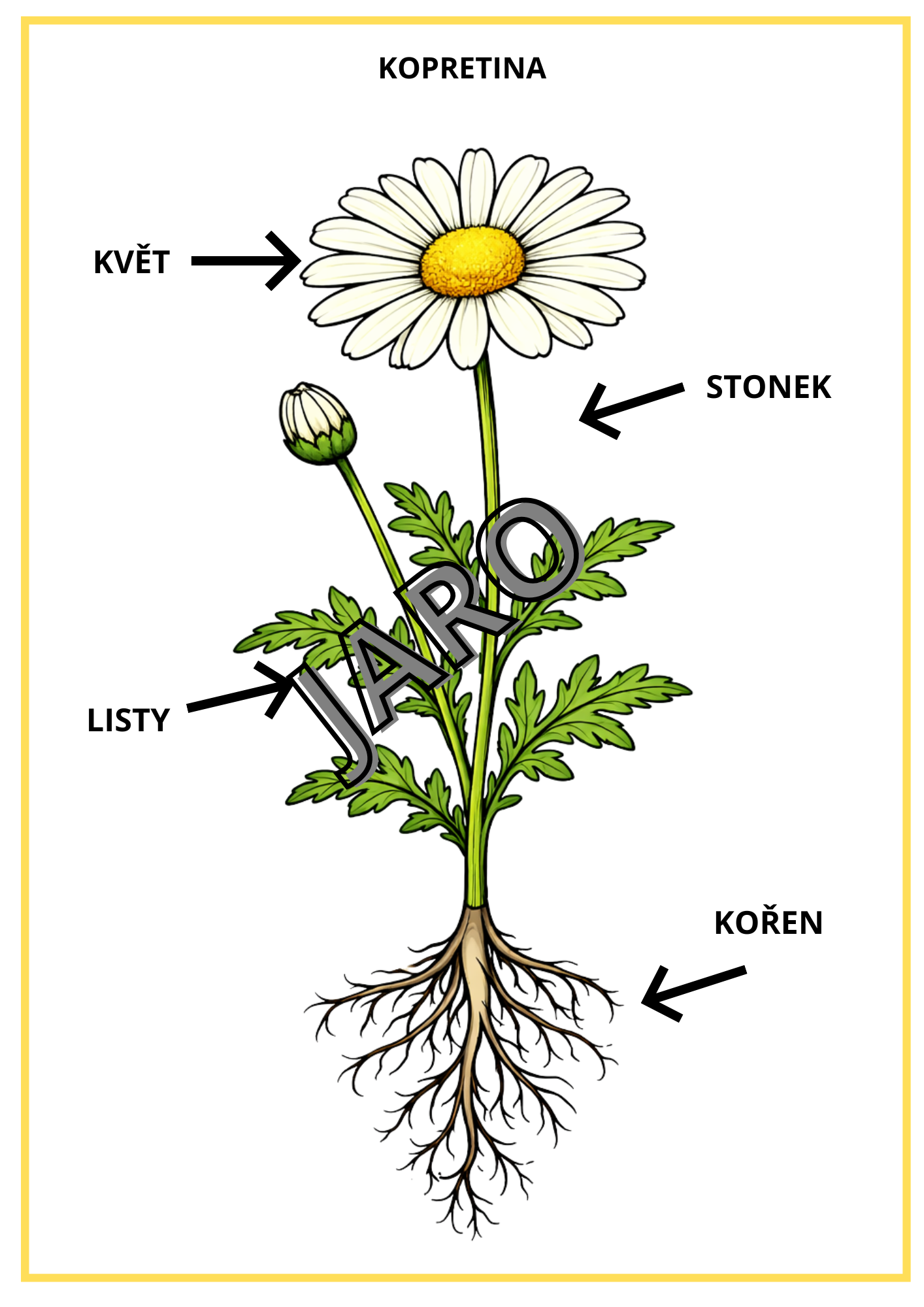- jarní květiny: sněženka, bledule, tulipán, narcis, sedmikráska, pampeliška, prvosenka, kopretina, fialka, hyacint, modřenec, krokus