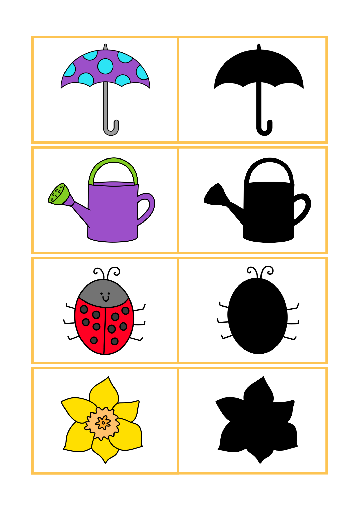 - 12 dvojic = 24 kartiček (barevné obrázky + odpovídající stíny)