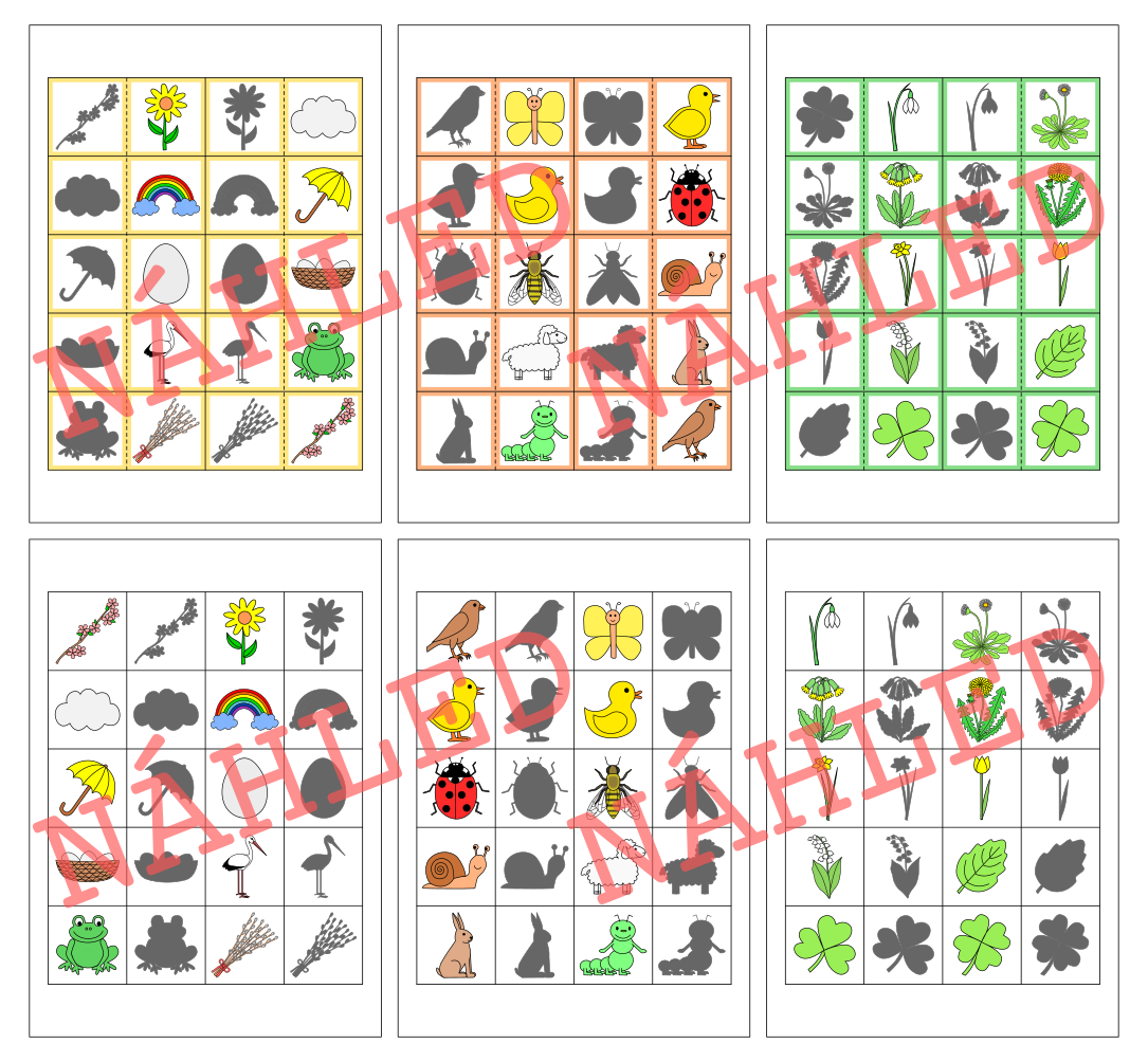 Materiál obsahuje tři strany s kartičkami domina (1 strana = 1 sada kartiček domina = 10 kartiček) a tři strany s kartičkami pexesa (30 dvojic). Tématem je jaro.