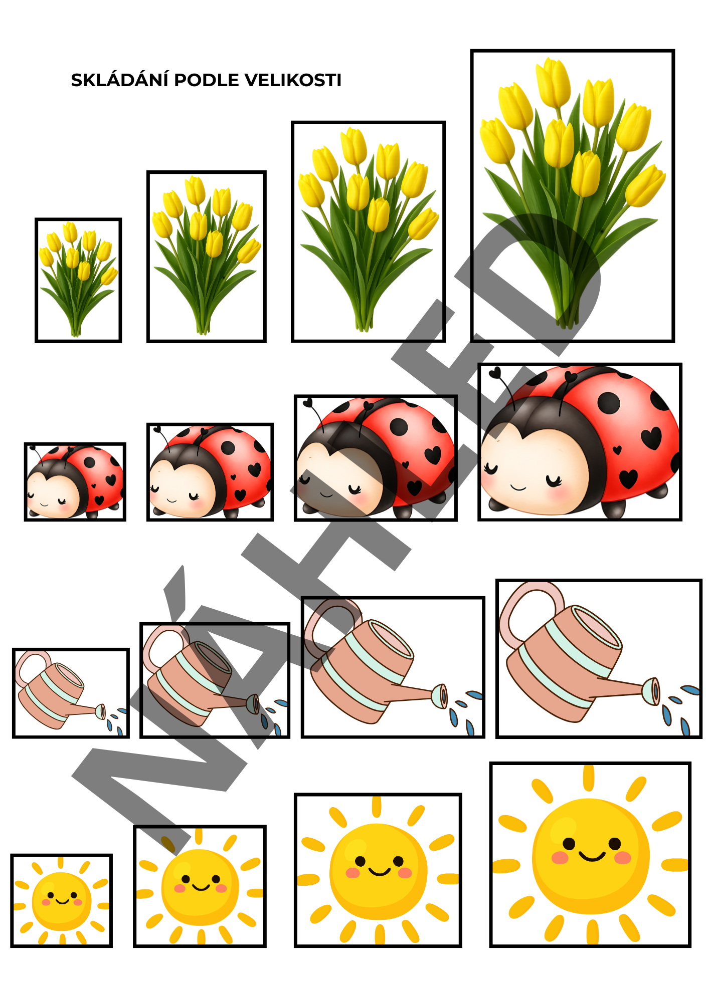 - Skládání podle velikosti: Rozlišování a řazení jarních symbolů od nejmenšího po největší.