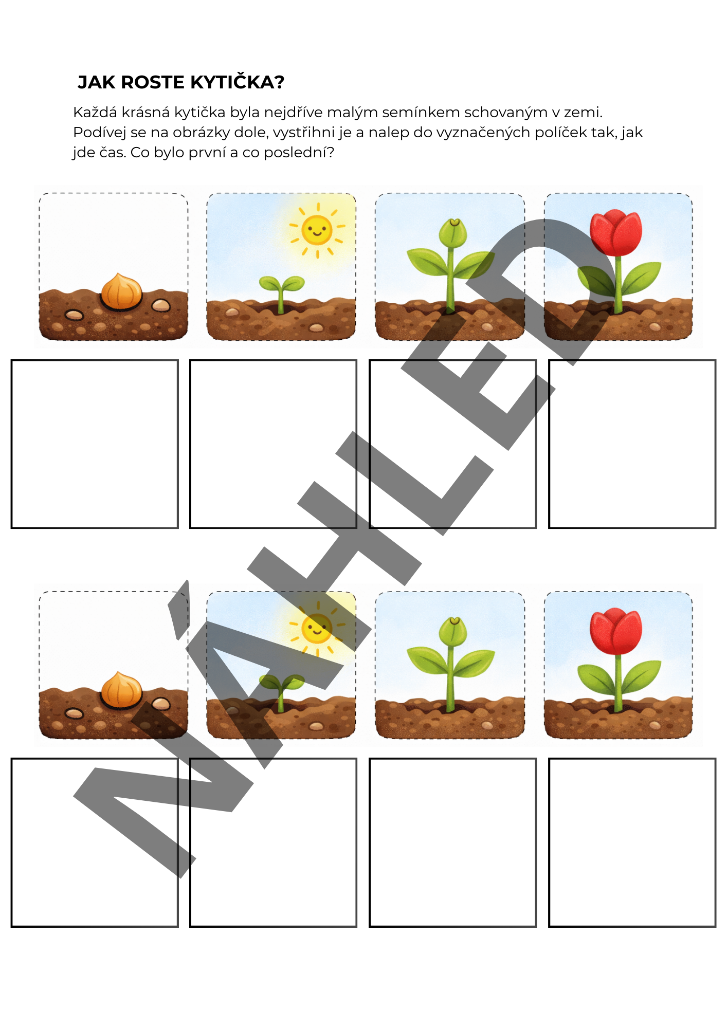 - Časová posloupnost: Aktivita zaměřená na životní cyklus rostliny, kdy děti vystřihují obrázky a lepí je do políček podle toho, jak kytička roste.