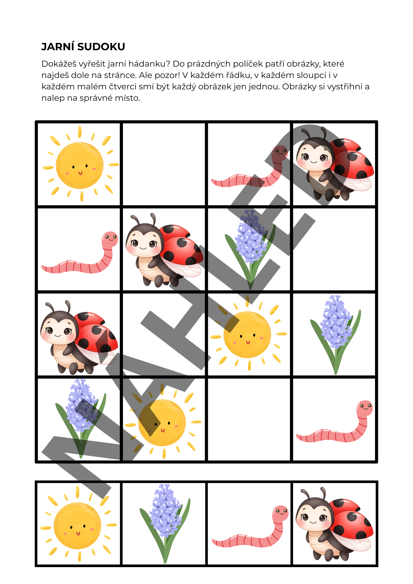 - Jarní Sudoku: Logická hra ve formátu 4x4, kde děti doplňují chybějící obrázky pomocí stříhání a lepení.