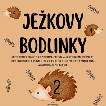 Soubor obsahuje 10 karet s ježky 🦔, přičemž každý ježek má na sobě napsané jiné číslo od 1 do 10. Úkolem dítěte je správně spočítat, kolik bodlinek ježek potřebuje, a připnout mu na záda odpovídající počet kolíčků.