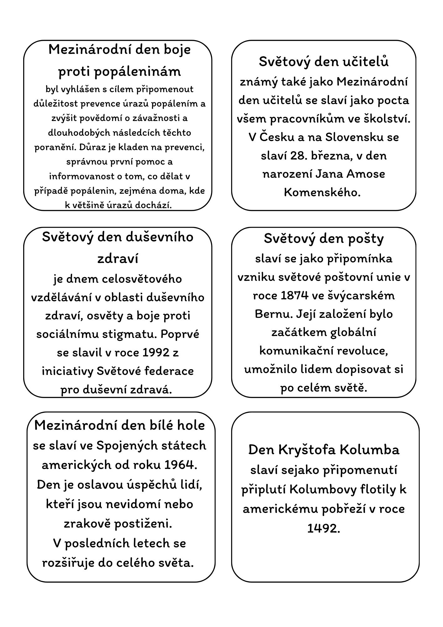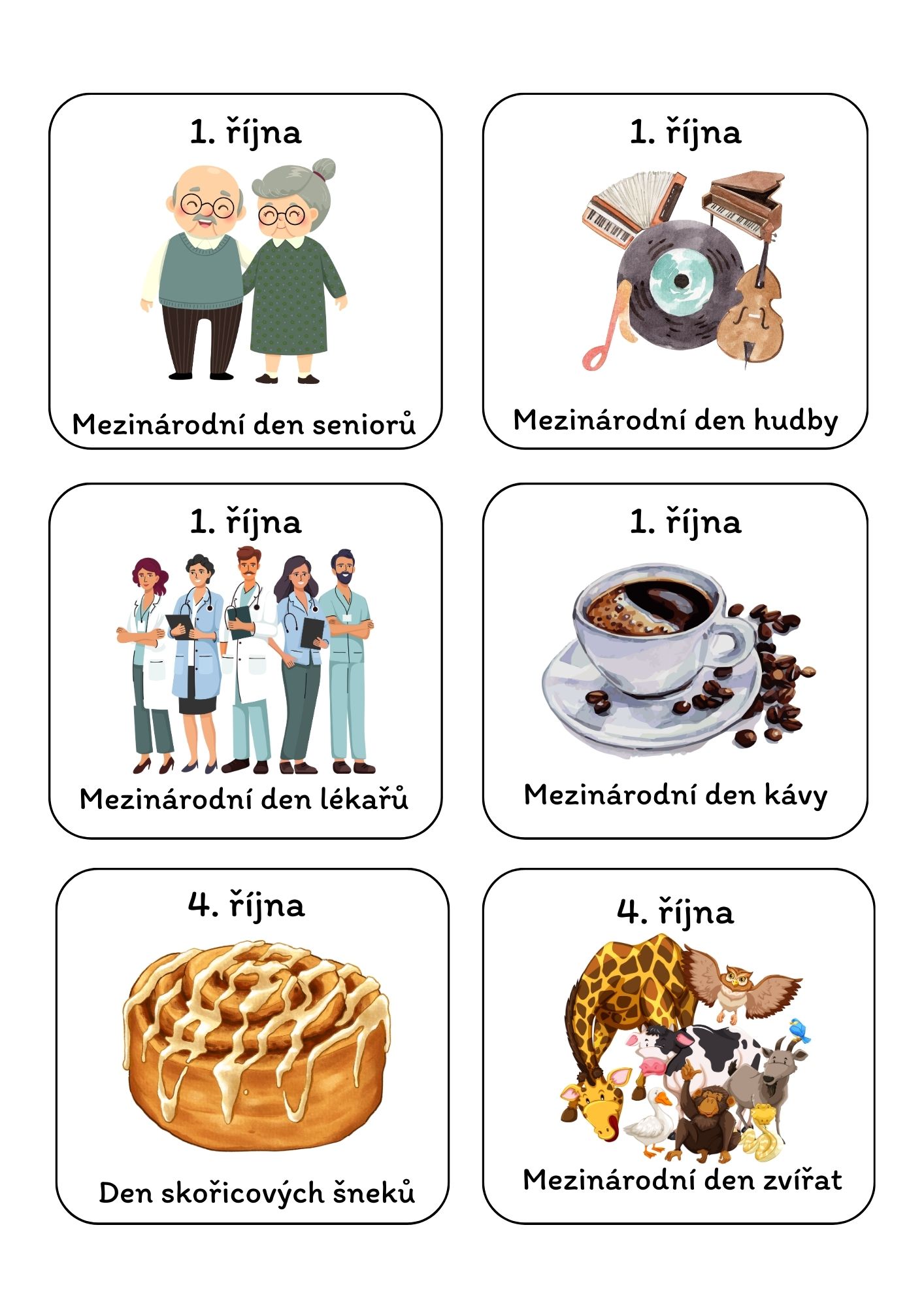 Hledáte inspiraci, jak oživit podzimní dny ve třídě nebo ve školní družině? Připravila jsem pro vás sadu kartiček, které představují zajímavé a významné dny, jež se slaví v měsíci říjnu.