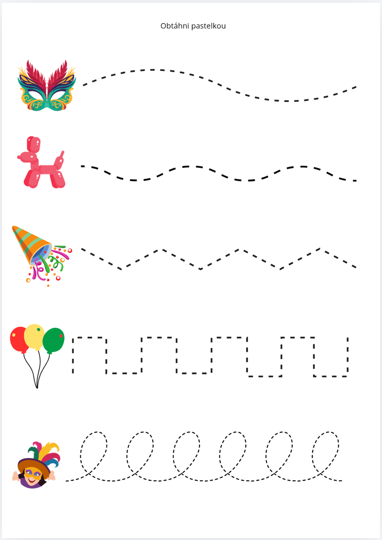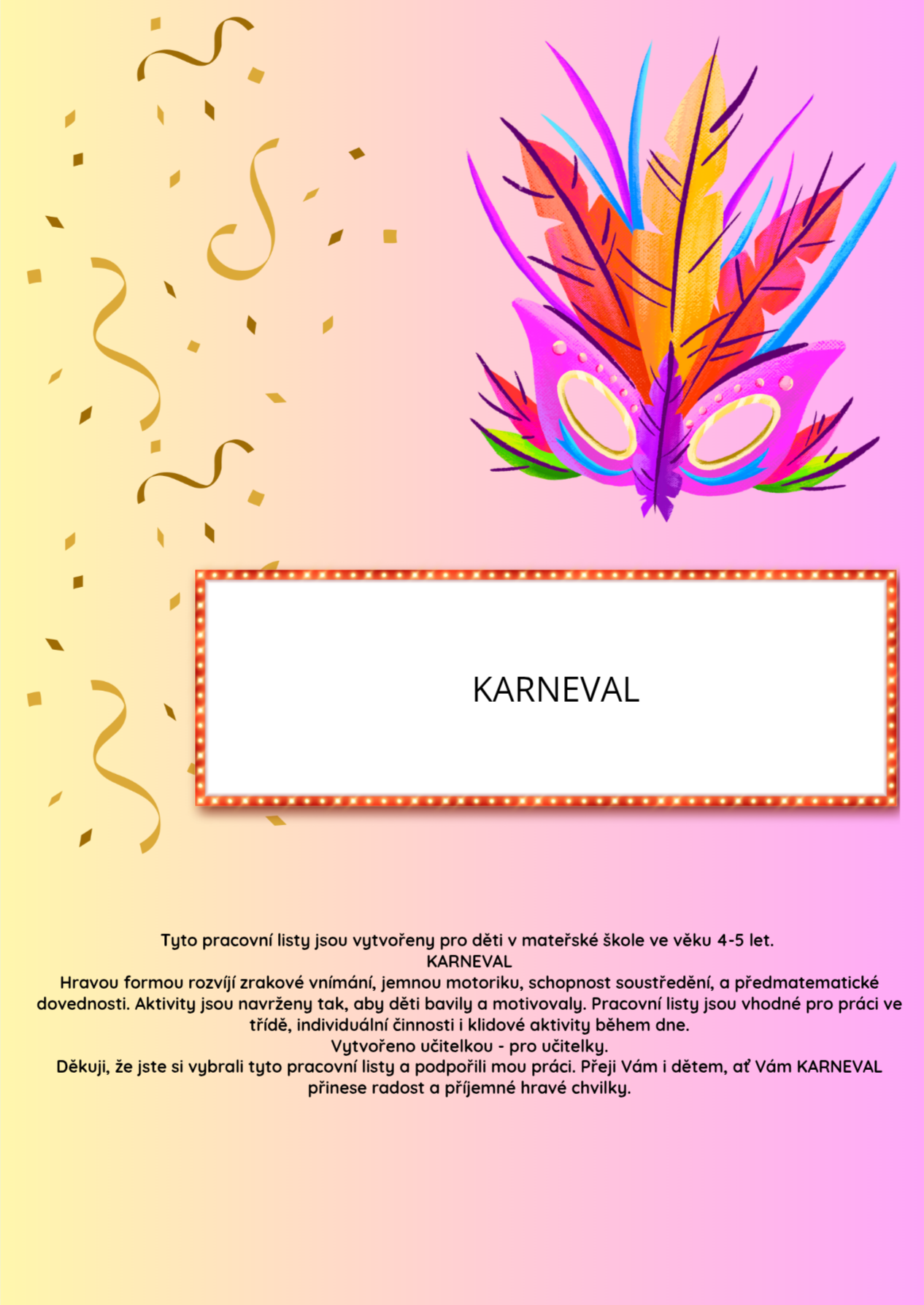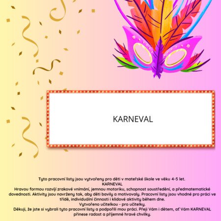 Tyto pracovní listy jsou vytvořeny pro děti v mateřské škole ve věku 4-5 let. KARNEVAL Hravou formou rozvíjí zrakové vnímání, jemnou motoriku, schopnost soustředění, a předmatematické dovednosti. Aktivity jsou navrženy tak, aby děti bavily a motivovaly. Pracovní listy jsou vhodné pro práci ve třídě, individuální činnosti i klidové aktivity během dne. Vytvořeno učitelkou - pro učitelky. Děkuji, že jste si vybrali tyto pracovní listy a podpořili mou práci. Přeji Vám i dětem, ať Vám KARNEVAL přinese radost a příjemné hravé chvilky