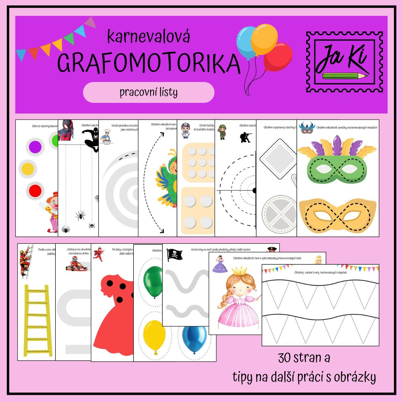 30 stran pracovních listů k procvičování základních grafomotorických prvků, spíše jednodušších - čáry všemi směry, kruhy, horní a spodní oblouk, spirála, lomená čára, cestičky atp. Určeno dětem školkového věku nebo mladšího školního s dysfunkcemi. Téma karneval - typické karnevalové prvky jako vlaječky, balonky, klauni, masky... a také spousta oblíbených dětských kostýmů - princezny, piráti, vojáci, doktoři, zvířátka, hasiči, policista atd. - vždy 1 tematický motiv a 1 grafomotorický prvek k procvičení na jednu stranu A4, na každé straně je jeden či více obrázků, s nimiž se dá dále pracovat na rozvoji komunikativních dovedností a řečových schopností, zrakového vnímání a rozumových schopností - na průvodním listu v materiálu je mnoho návodných otázek.