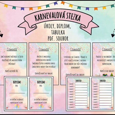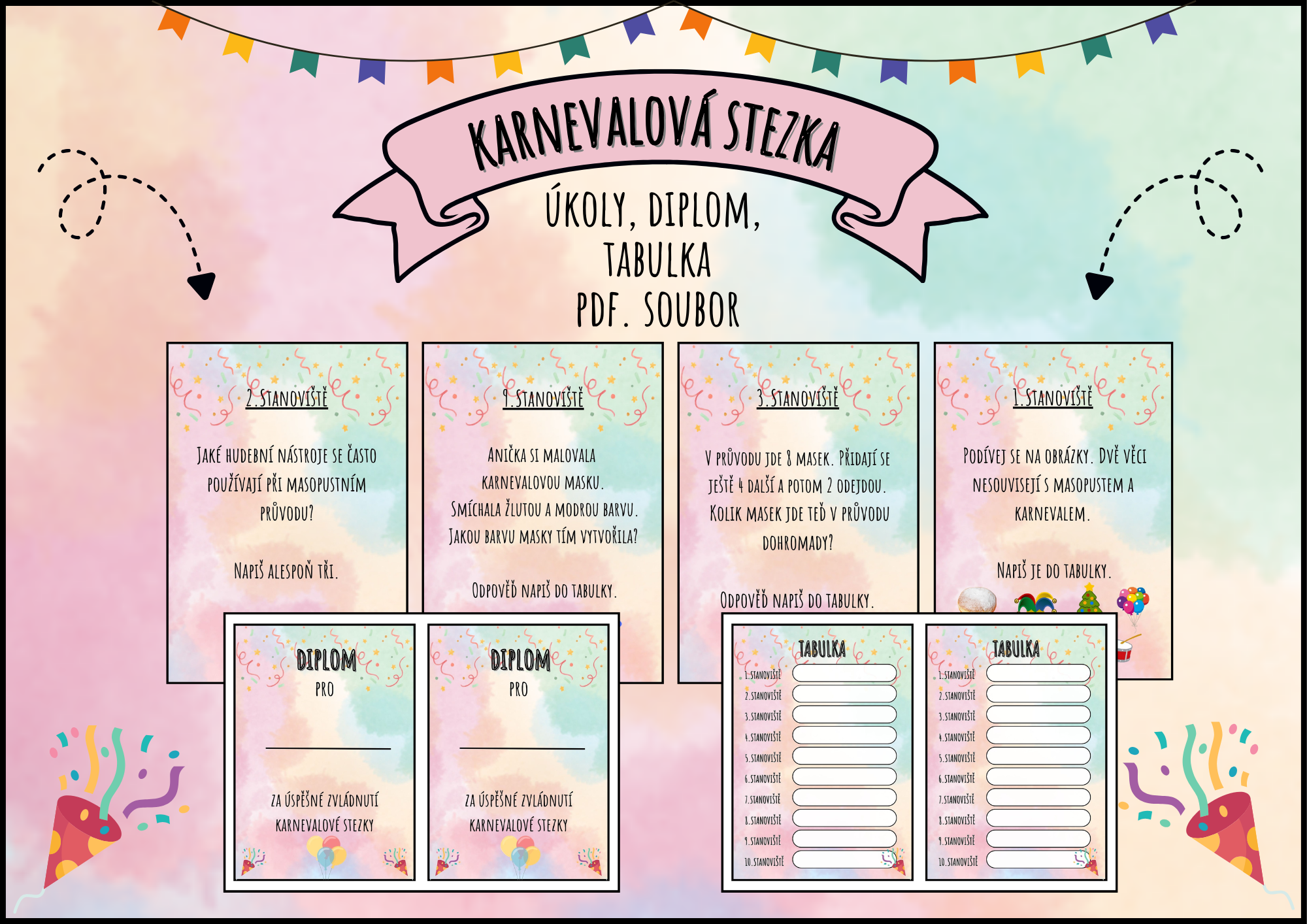 Karnevalová stezka je krátká vzdělávací a zábavná aktivita zaměřená na masopust, karneval, masky a tradice. Je určena pro žáky 1.–4. ročníku a lze ji realizovat ve třídě, na chodbě, v tělocvičně nebo venku.