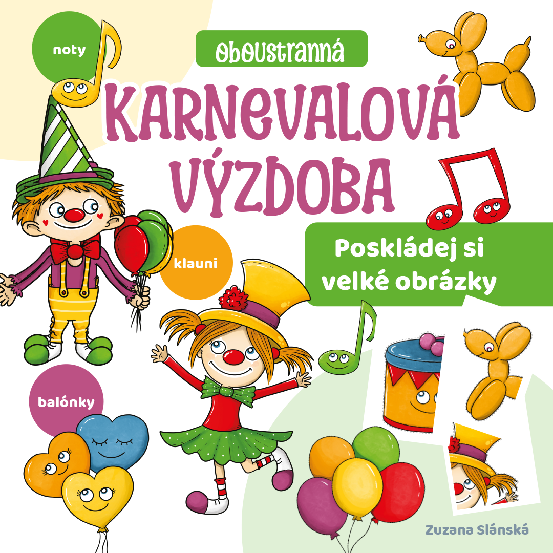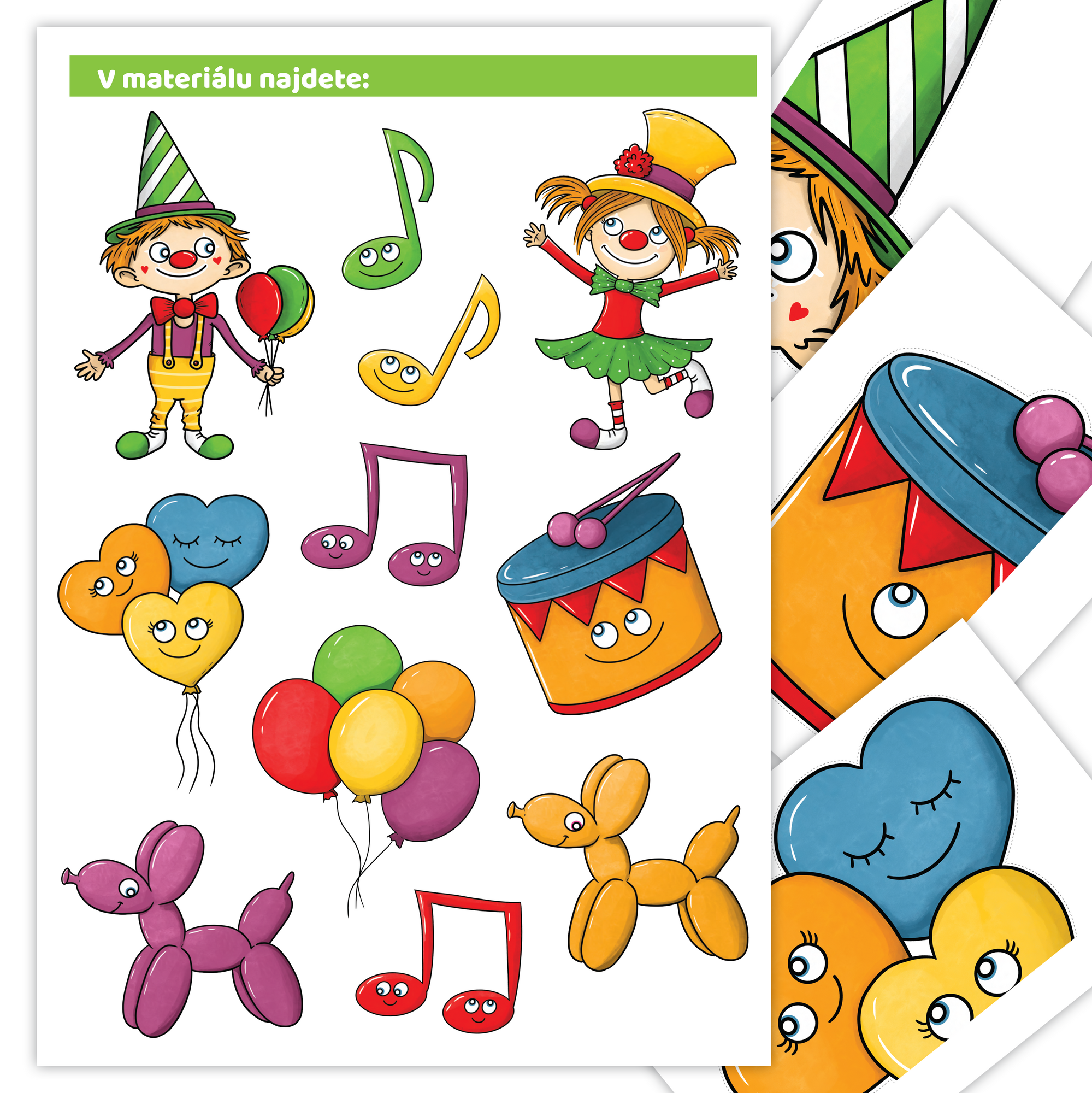 Motivy dvou veselých klaunů jsou doplněny notami, balónky i veselým bubínkem. Vše je sladěno do jednotných barev, aby se vše krásně propojilo.