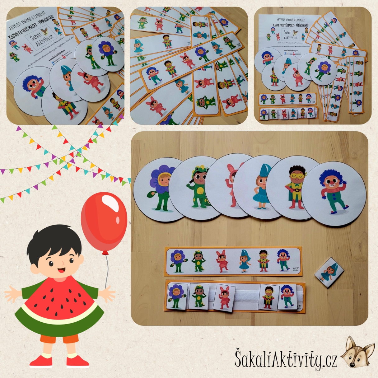 Soubor obsahuje celkem 24 předlohových karet s různou úrovní obtížnosti, kde děti pracují s řadami o 3, 4, 5 nebo 6 karnevalových masek a přiřazují k nim odpovídající barevné kombinace na volnou kartu. Díky postupnému zvyšování náročnosti lze aktivitu snadno přizpůsobit věku a schopnostem dětí.