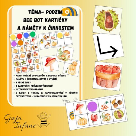 Tato podzimní sada tematických kartiček rozvíjí u dětí logické myšlení, prostorovou orientaci a slovní zásobu. Hravou formou je motivuje k objevování podzimní přírody, práce s trasami Bee-Bota vede k soustředění, plánování kroků a spolupráci ve skupině.