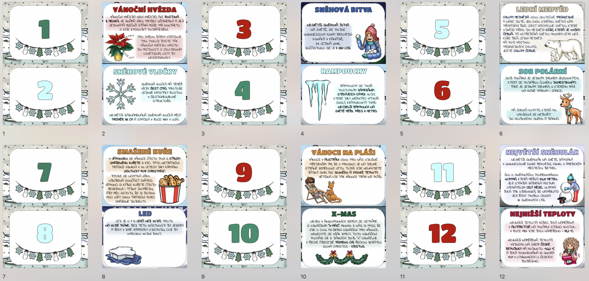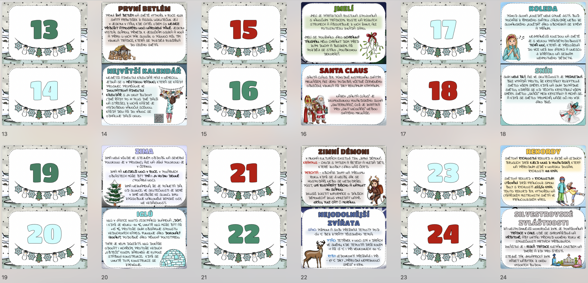 - Možnost využití jako adventní kalendář – karty například vložit do obálek nebo srolovat do ruliček a vyvěsit ve třídě.