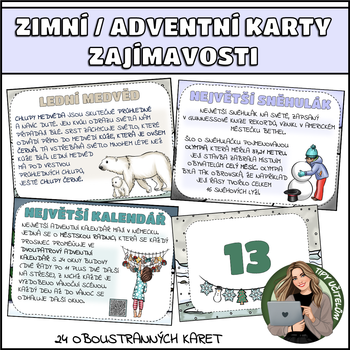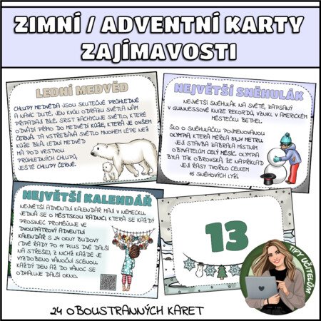 Tyto adventní karty jsou určeny prakticky pro všechny věkové kategorie. Každá karta Vás seznámí s nějakou zajímavostí z okruhu zimy, zimních zvířat, Vánoc… Zkrátka karty pro celé období adventu.