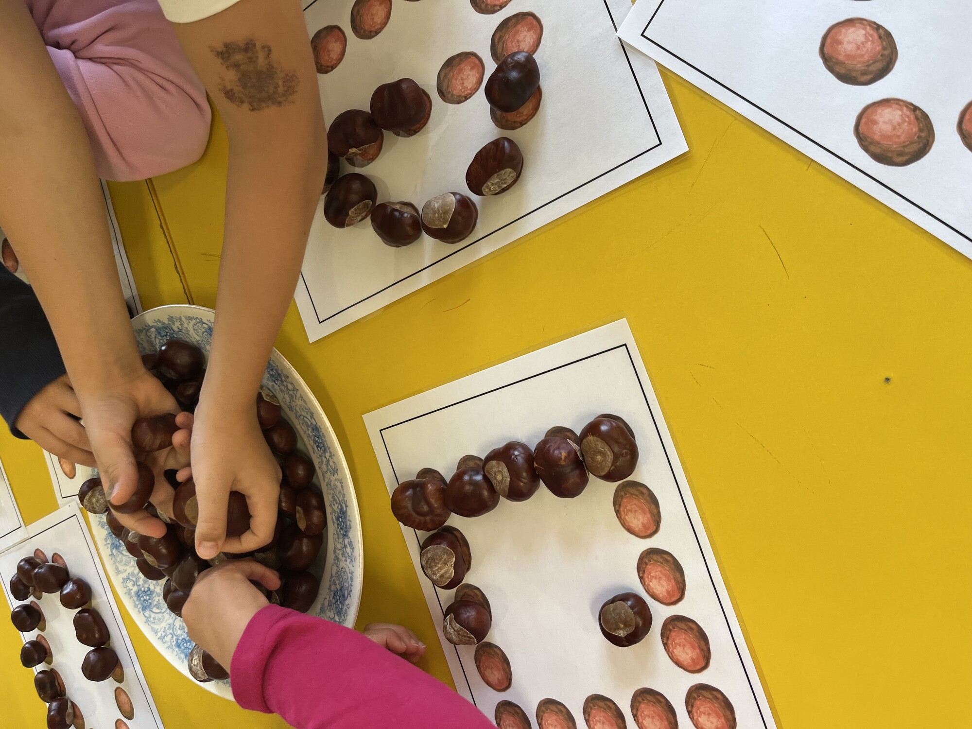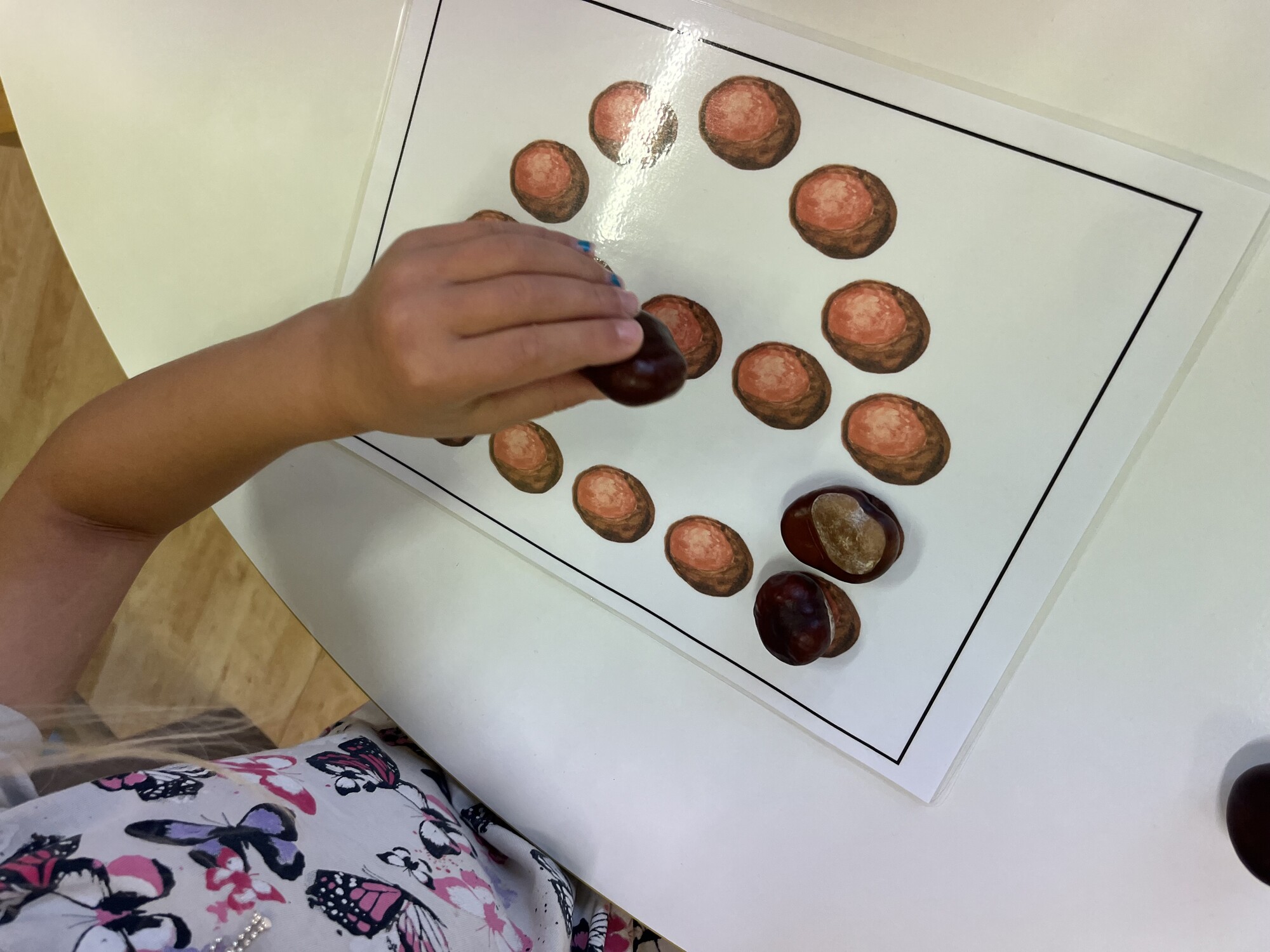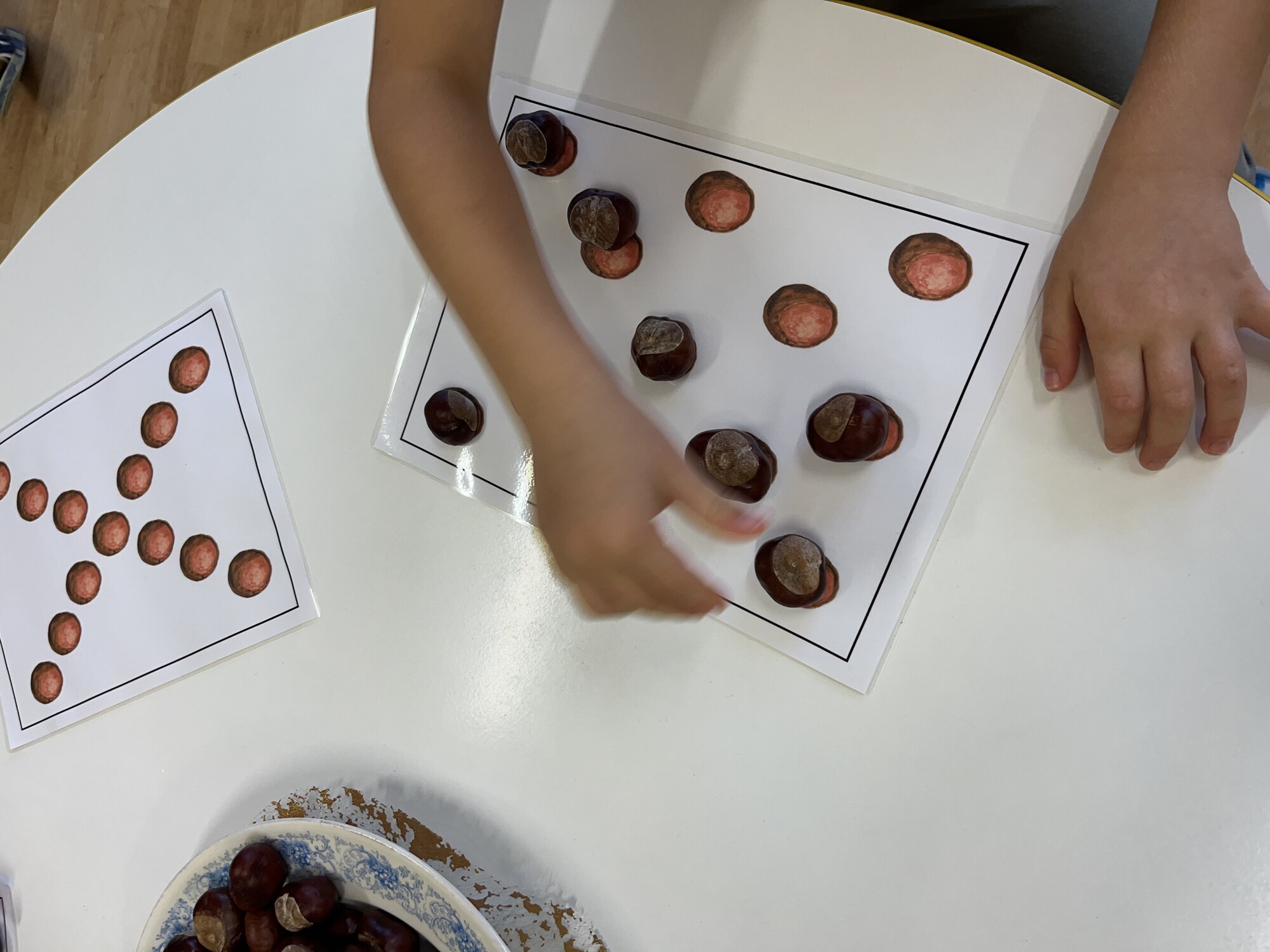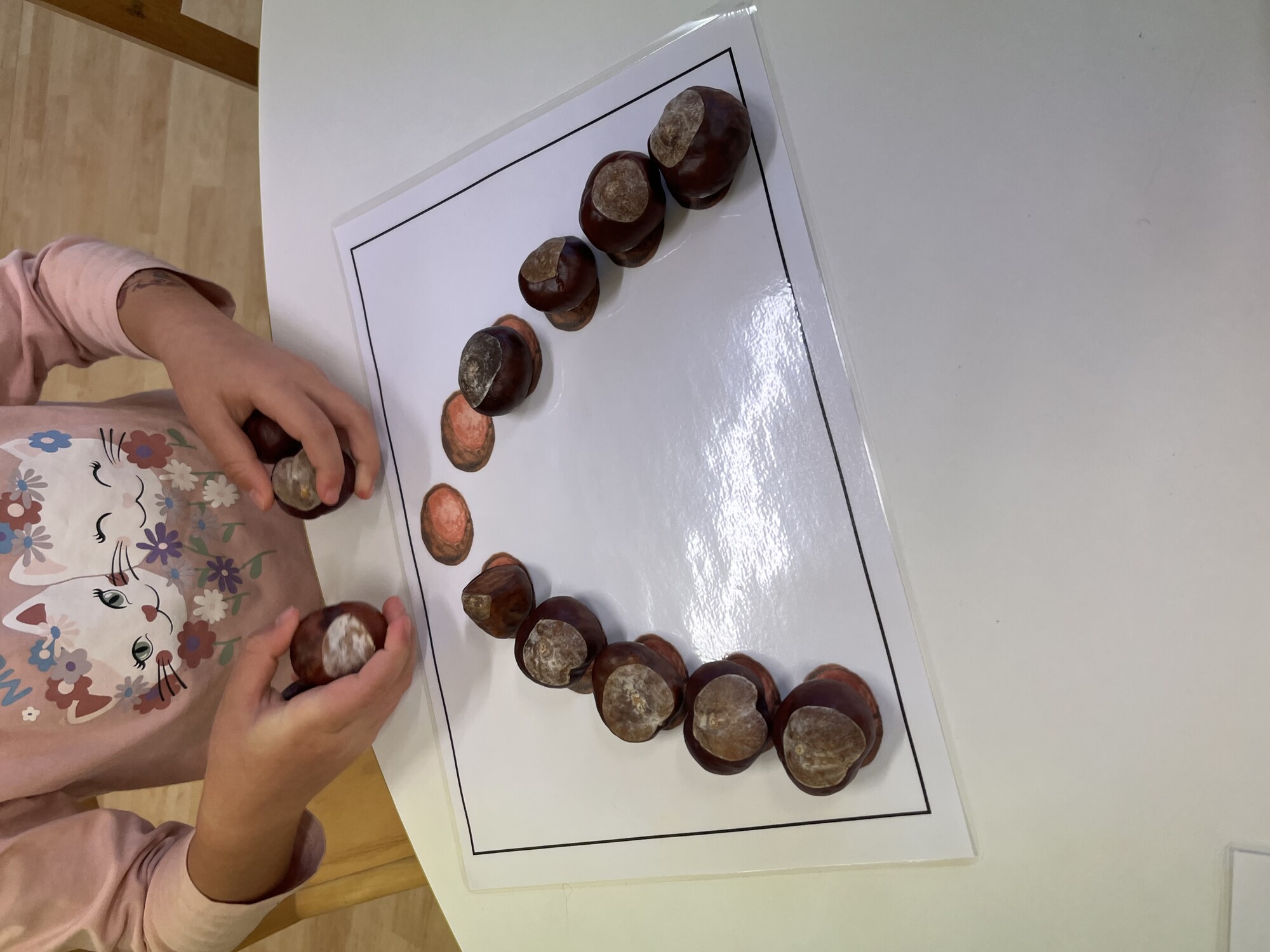 Vybrané karty vytiskněte na papíry A4 a zalaminujte. Děti mají šablony k dispozici a kaštany skládají přímo na předlohu. Kaštany s dětmi můžete nasbírat během pobytu venku nebo je děti mohou nasbírat s rodiči a přinést do třídy.
