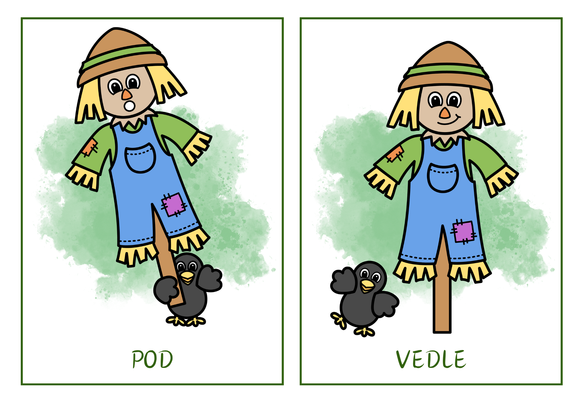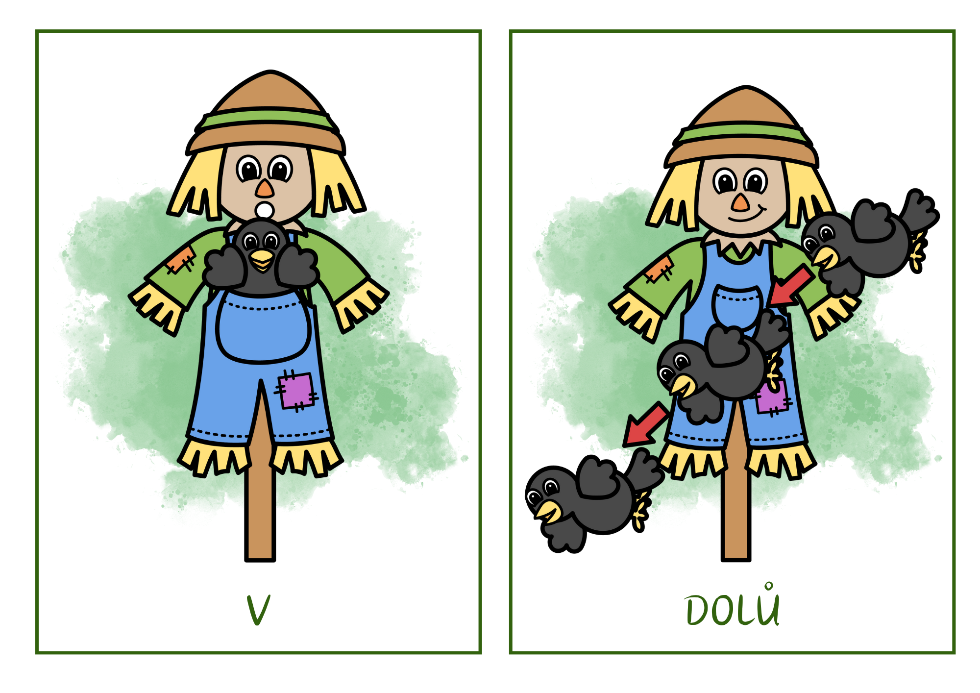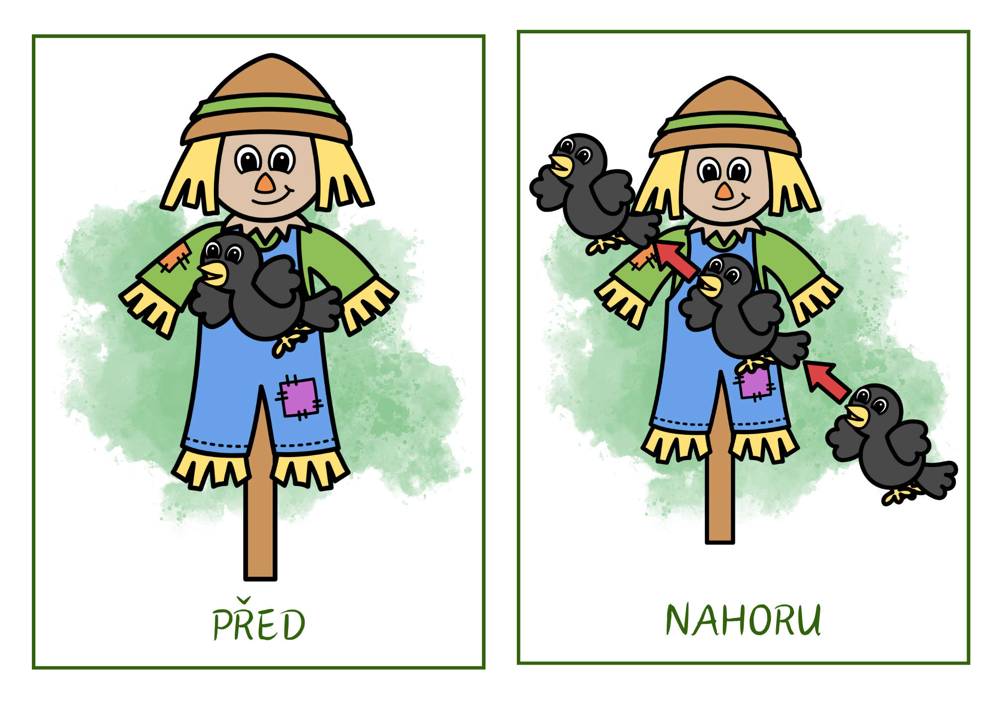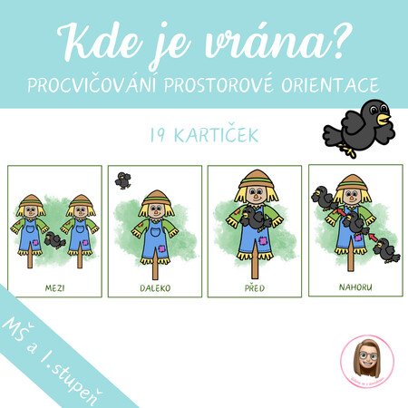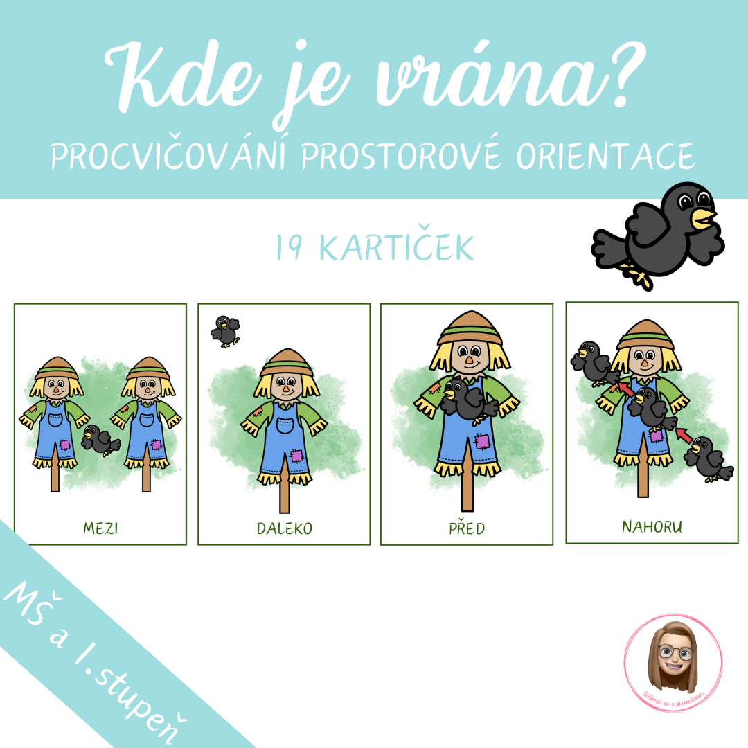 Zábavná sada obrázkových kartiček zaměřená na rozvoj prostorové orientace a řečových dovedností. Děti se hravou formou učí používat předložky (nad, pod, za, vedle, mezi, před…) a správně popisovat, kde se vrána nachází.