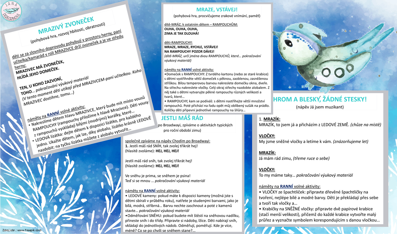 Pdf soubor KDYŽ MRÁZ BARVÍ UŠI – tematická PŘÍPRAVA na téma ZIMA A MRÁZ KOLEM NÁS, nabízí autorské náměty na aktivity, které zařazujeme v rámci RANNÍCH volných her a ŘÍZENÉ činnosti. Náměty na POHYBOVÉ hry s jednoduchou říkankou, náměty na HUDEBNĚ-POHYBOVÉ činnosti s jednoduchou písničkou na známý nápěv a další.
