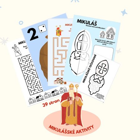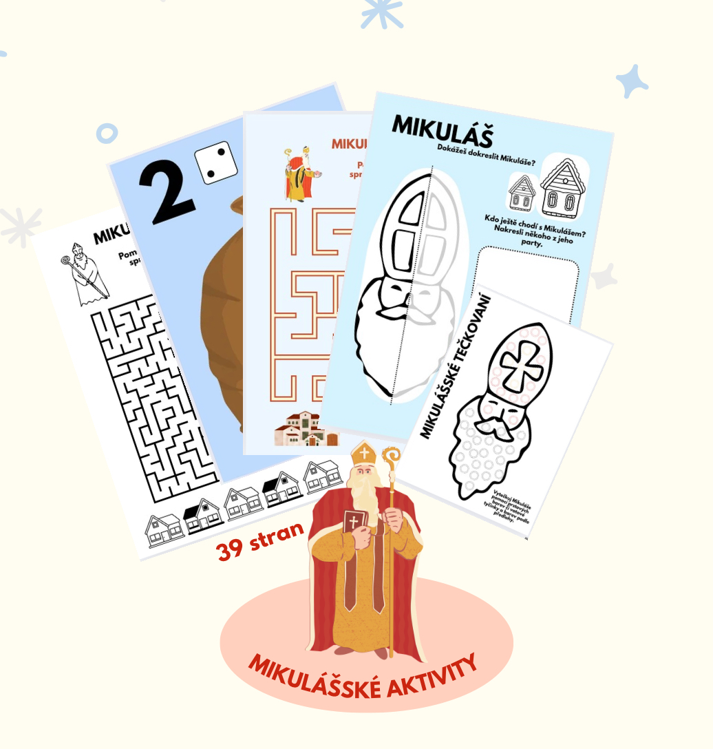 Soubor obsahuje prosvítací karty, tečkování, procvičení stříhání, bludiště, rozdíly, omalovánky a více. 🎅