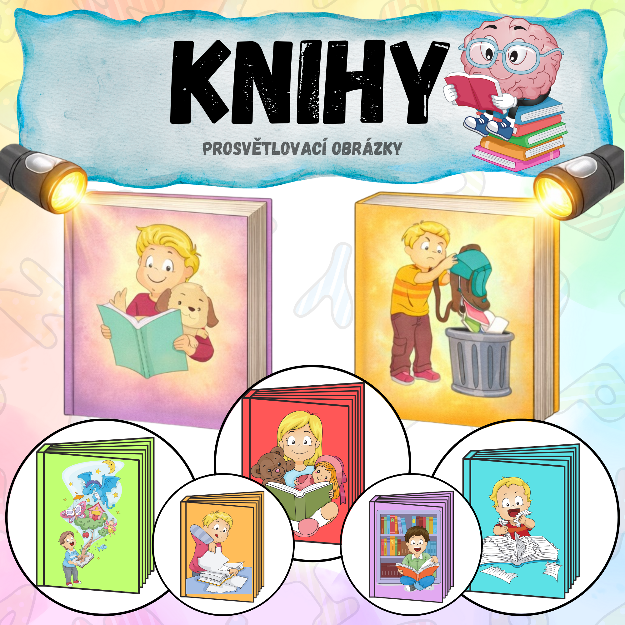 Dítě si vybere libovolný obrázek knihy a pomocí světla zkoumá, co se uvnitř skrývá. Následně objevuje různé obrázky, které využijeme s dítětem k popisu - podporujeme kladení otázek, rozšiřujeme slovní zásobu, procvičujeme souvislé vyjadřování a v určitých případech otevíráme diskuzi i o vhodném/nevhodném zacházení s knihou.
